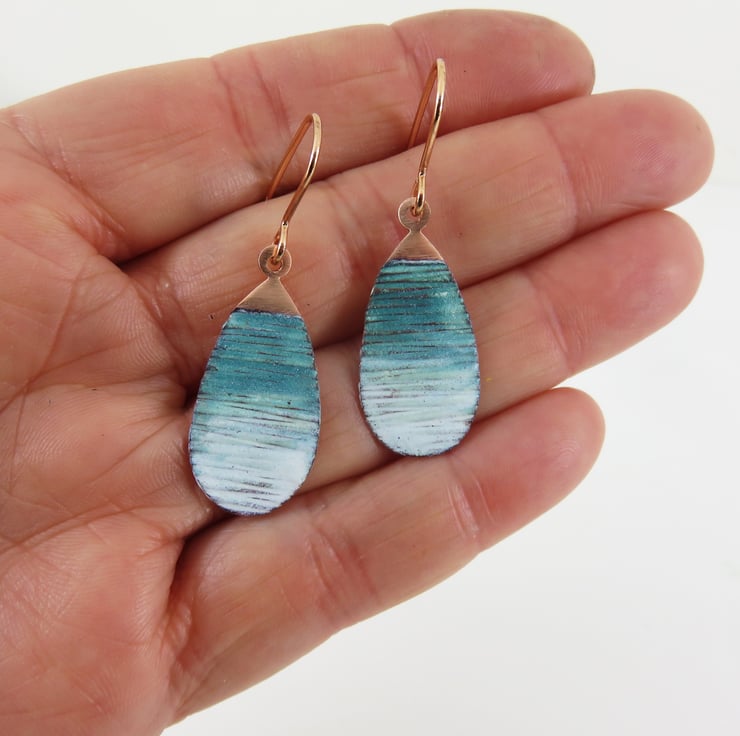 These copper tear drop dangle earrings are 2.5cm long and 1.3cm wide. The copper has been textured with diagonal lines by hand. Blue and white enamel has been applied and fired in the kiln at 830 degrees. They are then hung on rose gold plated wires. These earrings are posted out to you in a 830 Degree gift box.