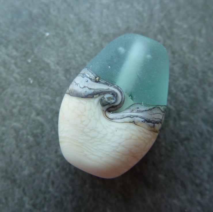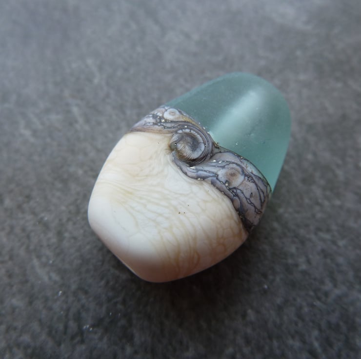 A lampwork glass focal bead made with ivory and aqua glass, it has been hand shaped and tumbled to give a smooth, frosted finish.