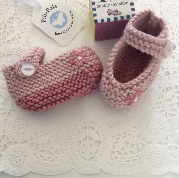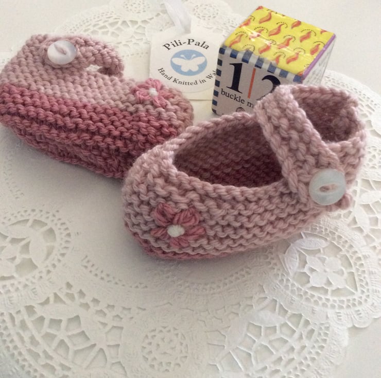 These soft Mary Janes have been hand knitted by me. They are knitted in a cashmere blend wool that is soft for babies feet but can also be machine washed at 30 degrees. They have a little embroidered flower on the front.