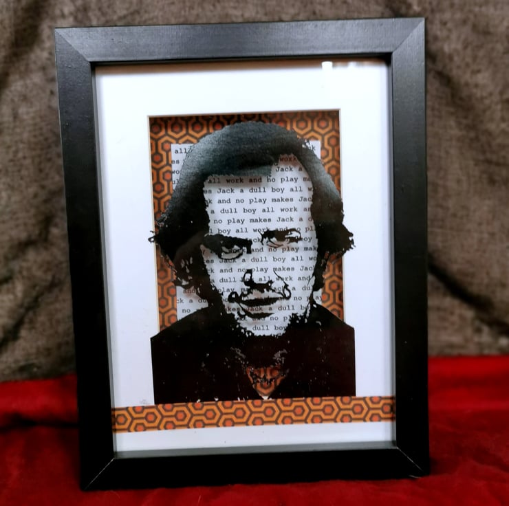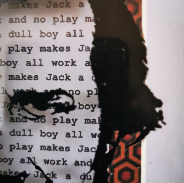 The background of this piece is based on the carpet of the hotel and a classic scene from the film, where Jack sits typing pages and pages of his novel while the Overlook Hotel plays with his mind and we find out that he has been writing the same words over and over again.