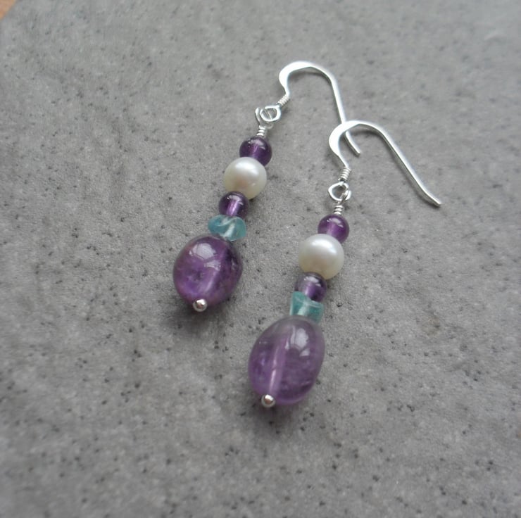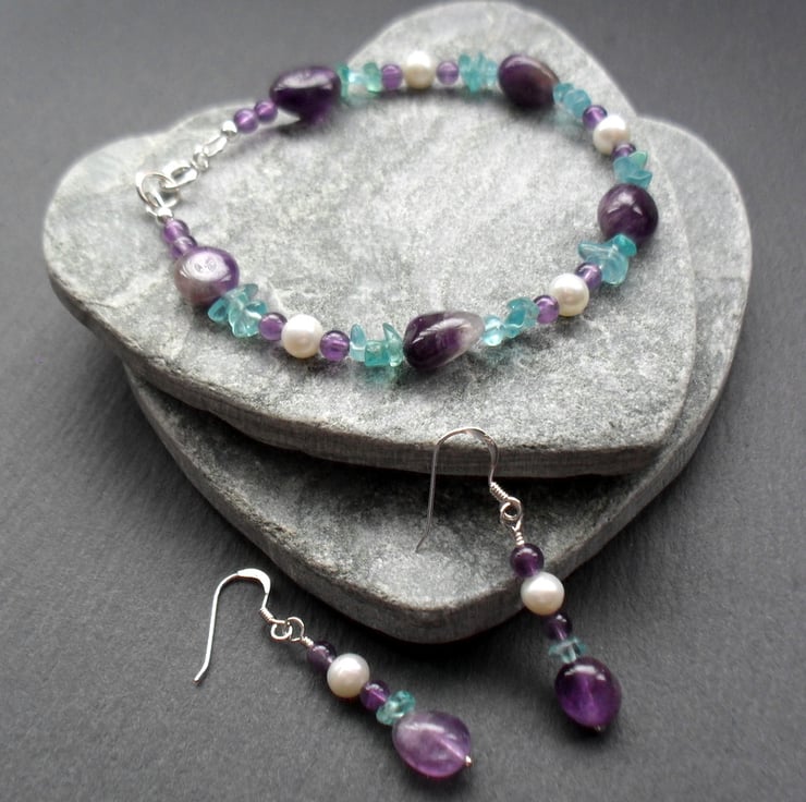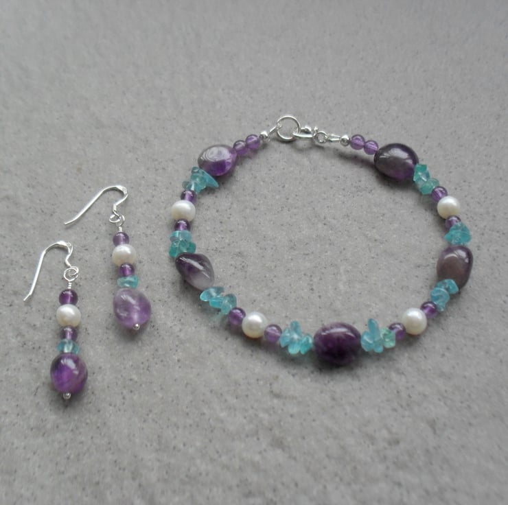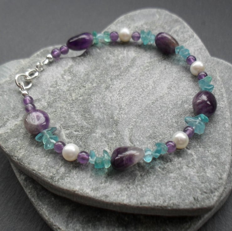 Amethyst freshwater pearl and small apatite nuggets semi precious gemstone bracelet with sterling silver clasp and findings