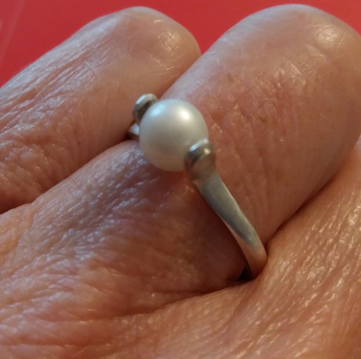 An elegant sterling silver ring with a white freshwater pearl rivet setting. The ring is size P. The pearl is 6.5mm in diameter.