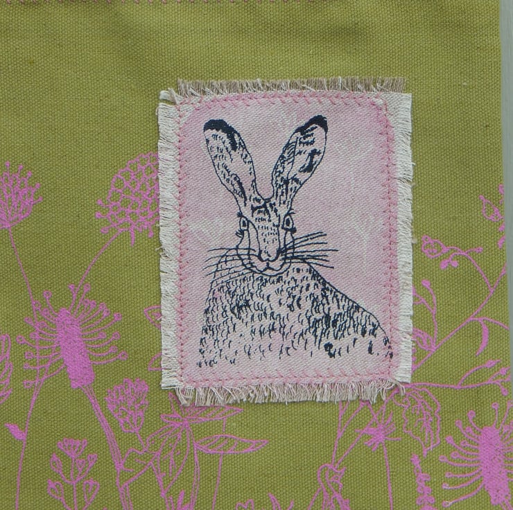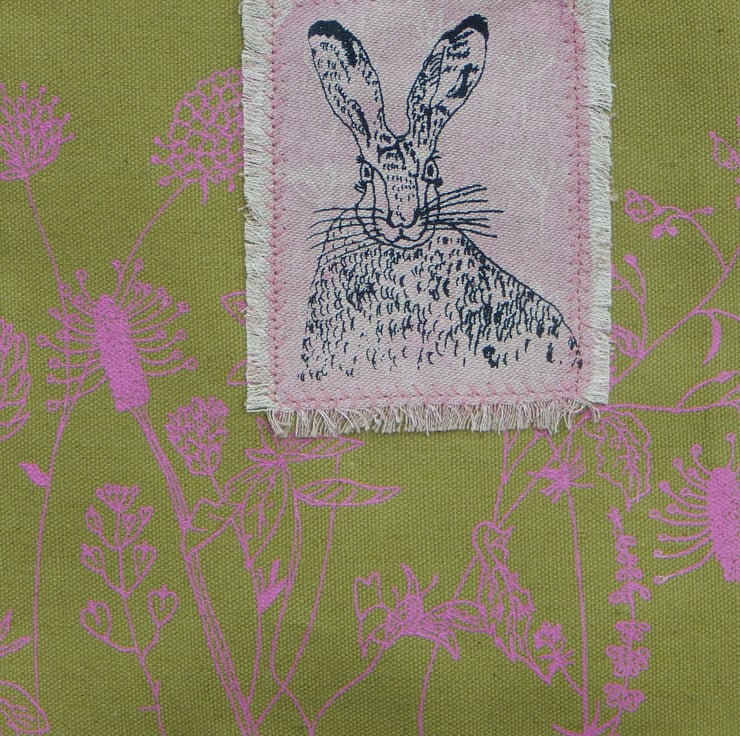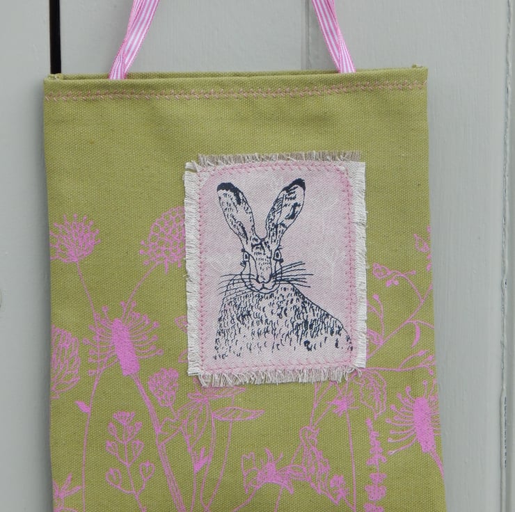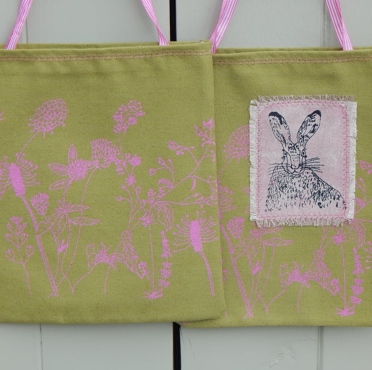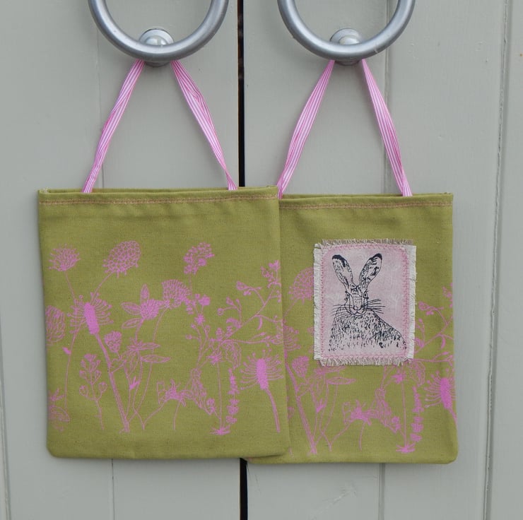 This is a small, light use canvas bag. It measures 28 cm in length by 22cm wide. There is a hare that has been screen printed on beige cotton with a pink lino print background. This has been appliqued onto the front of the bag. On the front and back of the bag is a wild flower hedgerow scene printed in pink.