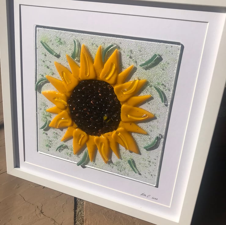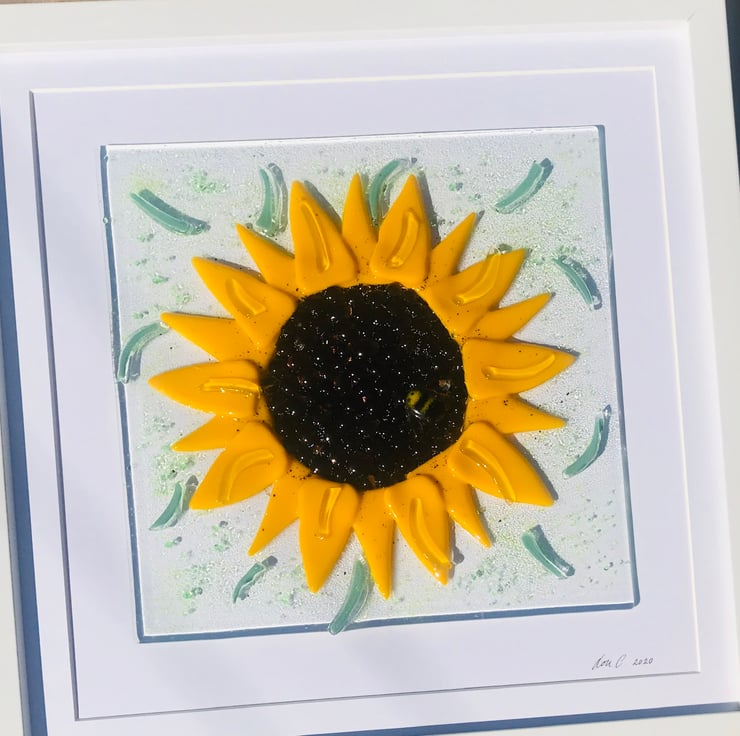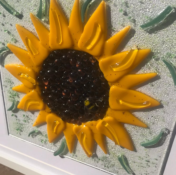 3 dimensional and textural fused glass sunflower with bumble bee detail . This lovely 30cm square picture is perfectly smooth yet textural and shiney . It is all hand cut glass which is then placed I my kiln for around 24hours . . The picture is send either by dpd or parcel force and will be well packaged and presented wrapped in tissue paper . I’m happy to add a personal note if it’s for a gift or can add one of my cards to the basket I will hand write for you