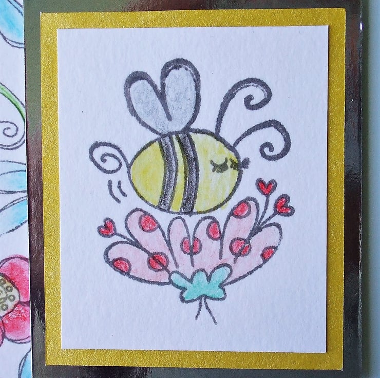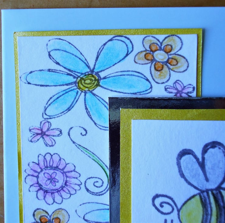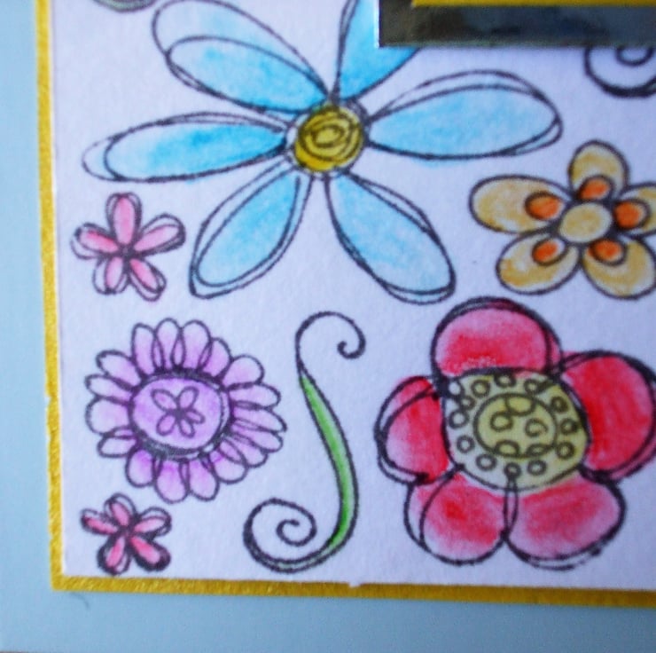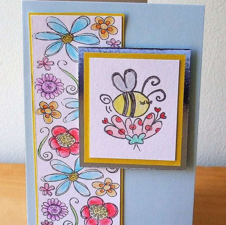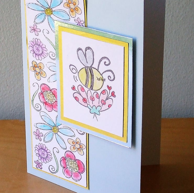 The bumble bee image and floral border have both been hand-stamped then filled in using watercolours. They have both been layered onto a sunshine yellow paper with a pearly finish and the bumble bee image has then been put onto a layer of pale blue foiled card. Both elements have been placed onto a pale blue card blank with the bumble bee image raised slightly using 3D foam pads.
