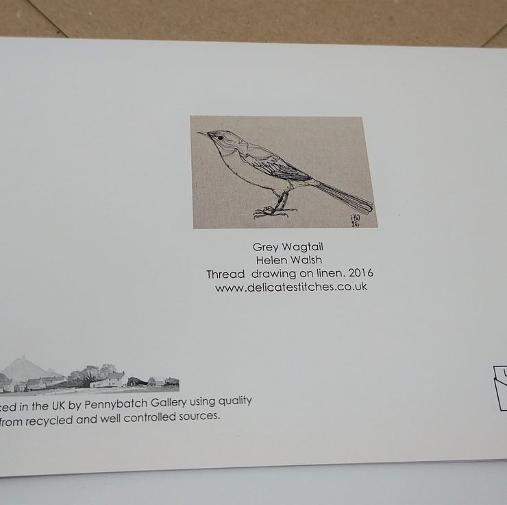 I often see Grey Wagtails at the burn at the bottom of my garden. Their distinctive 'wagtail' and beautiful colours always appeal to me. This card is a photographic print of my textile wagtail portrait, created with free motion embroidery. It's professionally printed on matt recycled card, is blank so you can create your own message and comes with a brown recycled card envelope. The card measures around 15 x 11 cm and the card and envelope will come to you in a cellophane wrapper to keep them nice and fresh.