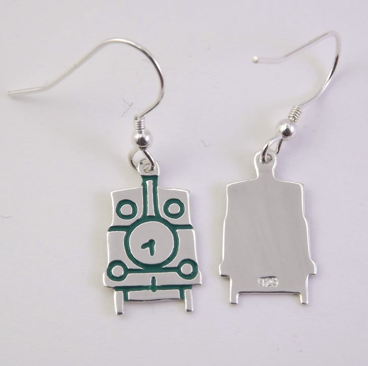 These steam engine drop earrings have been lovingly crafted by hand in Shropshire. They are made from recycled sterling silver and are etched before being cut by hand, the edges are then smoothed using files and emery paper. A resin based enamel is added to the etched areas and then the earrings are polished before being attached to ear wires.