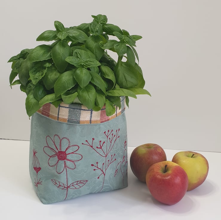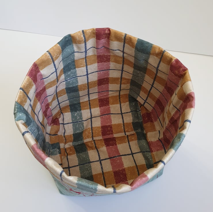Handmade here in Yorkshire, using remnants from bigger projects. Both the green outer and the checked lining fabrics used to be curtains in a previous life.