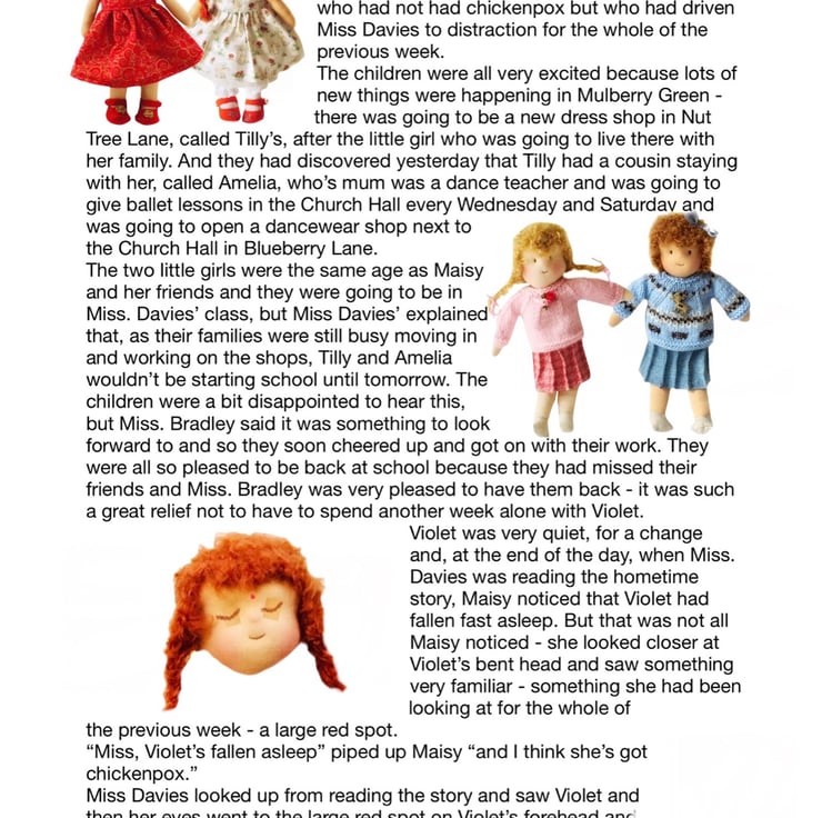 There are other children in Maisy’s class at school - Violet, Billy with his pet rabbit, Amber, Tilly, Rosie and her kittens, Amelia, Ruby, Marigold, Bobby with Max the dog, and the twins Oliver and Olivia, who have a puppy called Oscar. The dolls are all 26cm tall and baby Daisy is 16cm. Maisy and Mo love nothing more than having adventures with their friends. You can read about their adventures on my Facebook and Instagram pages - Maisy Muffin Rag Dolls and on my Mulberry Green Pinterest boards.