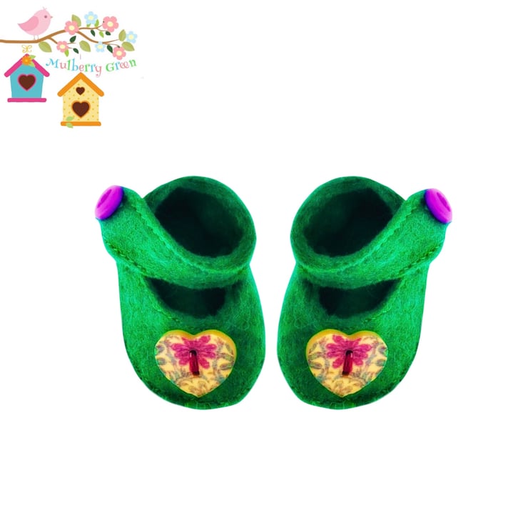 A cute little pair of green shoes, decorated with painted heart buttons to fit the Mulberry Green characters. The shoes are hand stitched using double layers of felt and fasten with a popper underneath a little button.