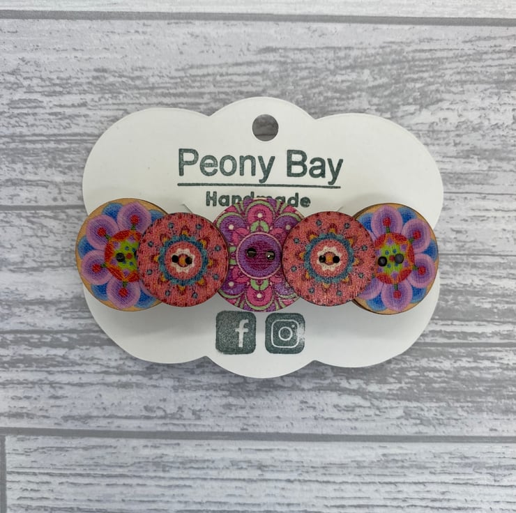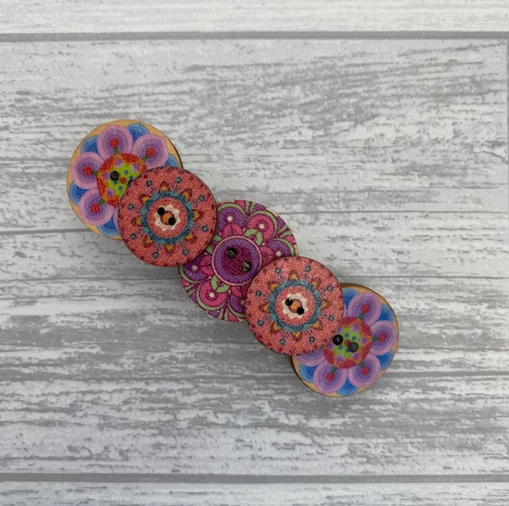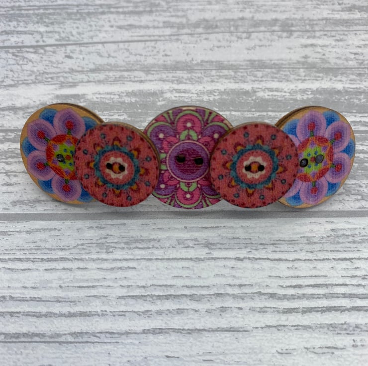 This barrette is made with buttons in three designs. There are three larger buttons on the bottom row - the two on the outside match and the middle button has a different design. Then there are two smaller buttons on the top row of matching design. They have different colours but the overall effect of the clip is pinky purple!