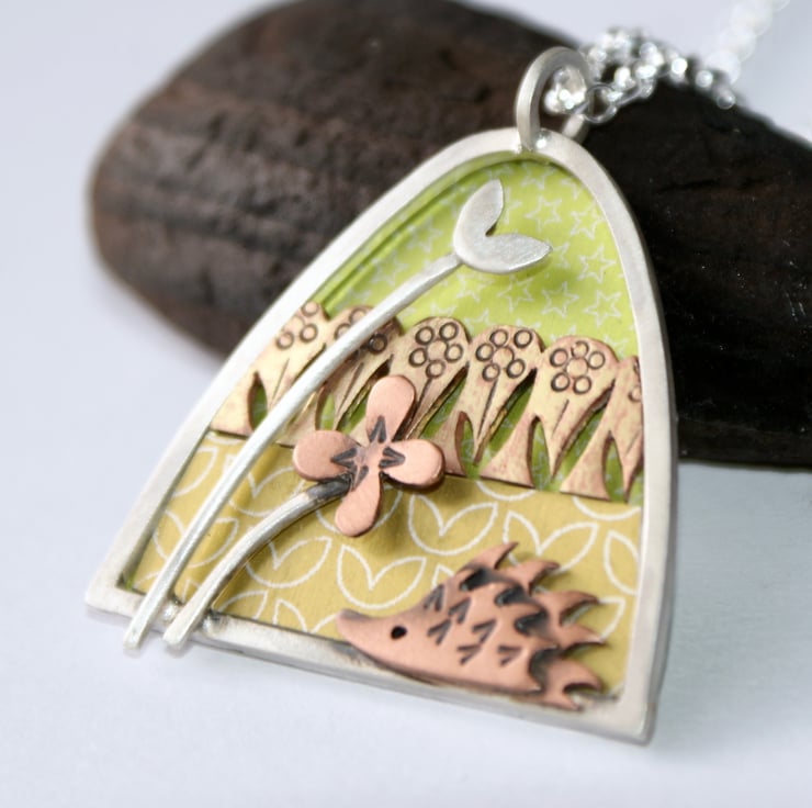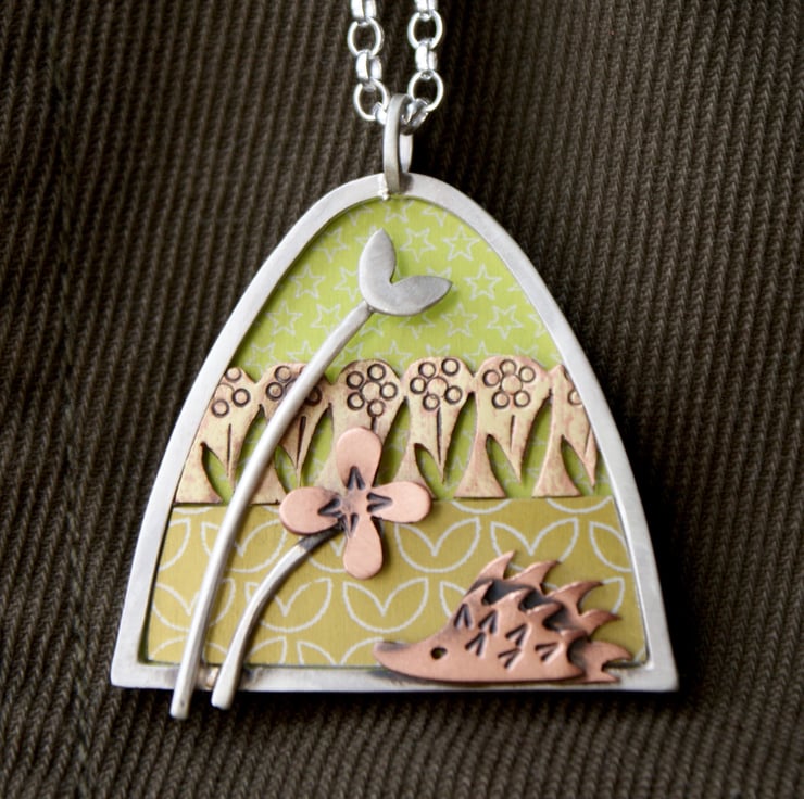A cute statement pendant featuring a featuring a little hedgehog walking through the garden. This necklace is made from anodised aluminium, sterling silver, copper and brass and each piece has been carefully cut with a piercing saw and constructed in layers. The coloured aluminium pieces are patterned with a resist and immersion dyed and the silver is textured and partly oxidised for depth. Hung from an 18 inch sterling silver chain. (Other lengths available).