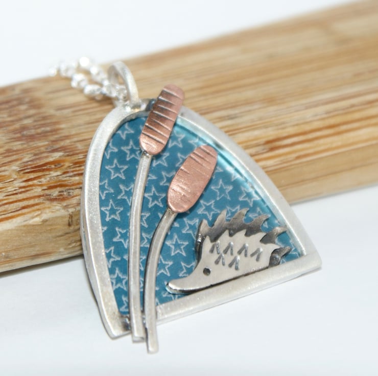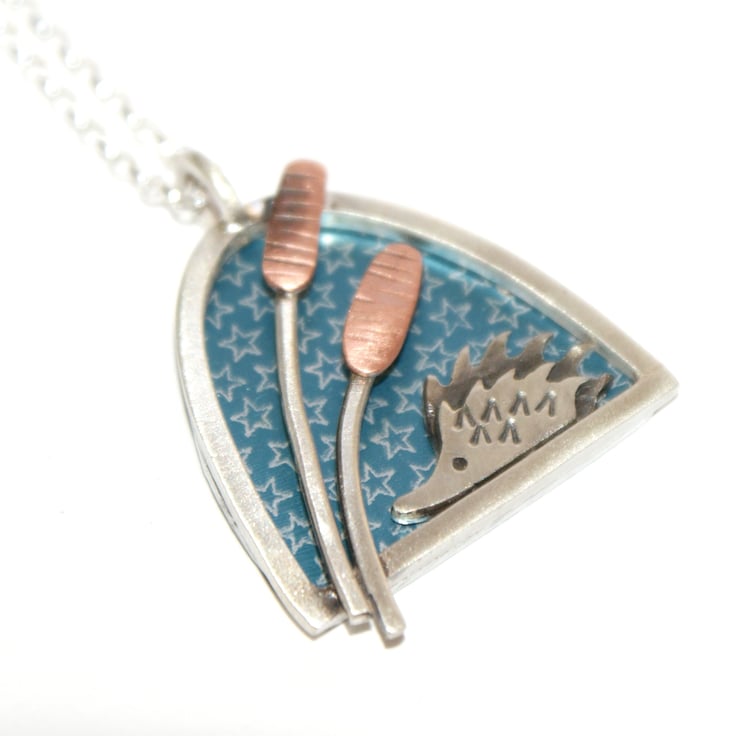 A cute pendant featuring a featuring a little hedgehog and 2 bullrushes. This necklace is made from anodised aluminium, sterling silver, and copper, and each piece has been carefully cut with a piercing saw and constructed in layers. The coloured aluminium piece is patterned with a resist and immersion dyed and the silver is textured and partly oxidised for depth. Hung from an 18 inch sterling silver chain. (Other lengths available).
