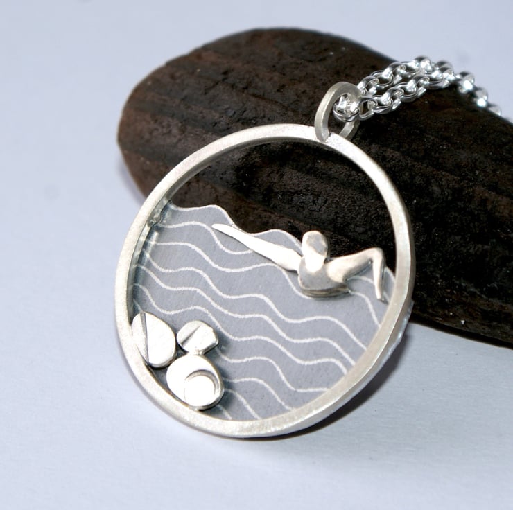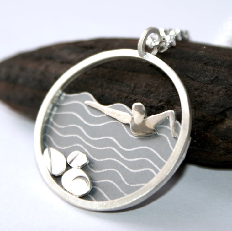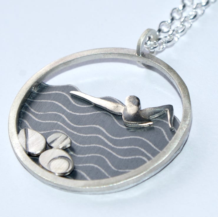 A lovely necklace featuring a swimmer in the sea. This brooch is made from anodised aluminium, and sterling silver and each piece has been carefully cut with a piercing saw and constructed in layers. The silver swimmer has oxidised details and the grey aluminium piece is patterned with a resist and immersion dyed. There are 2 little silver pebbles at the bottom of the sea.