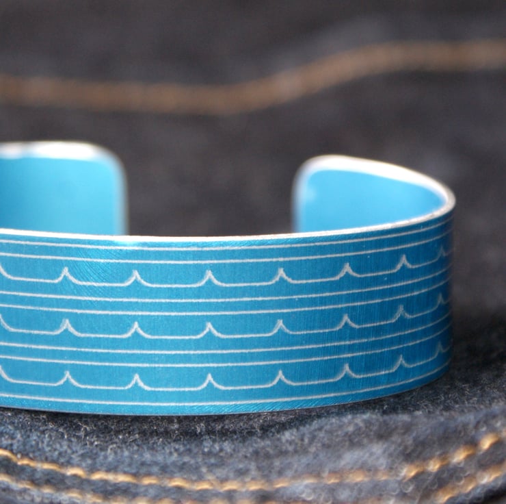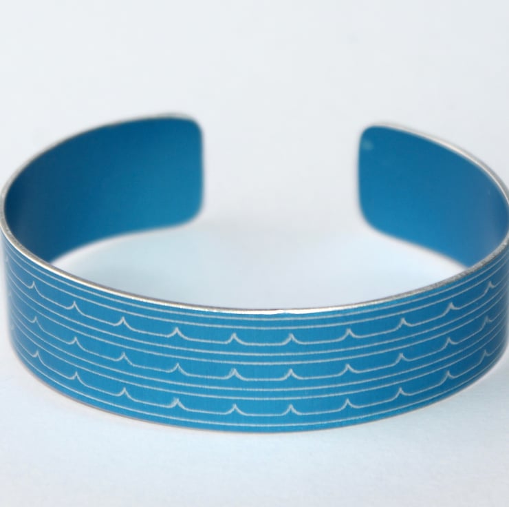 A striking bracelet/cuff made from anodised aluminium with a wave pattern designed digitally by me. I made the drawing into a resist and applied it to the metal. I then dye the aluminium, seal it and remove the resist which leaves the pattern showing in the original colour of the metal. The cuff is then made using traditional metalworking techniques.