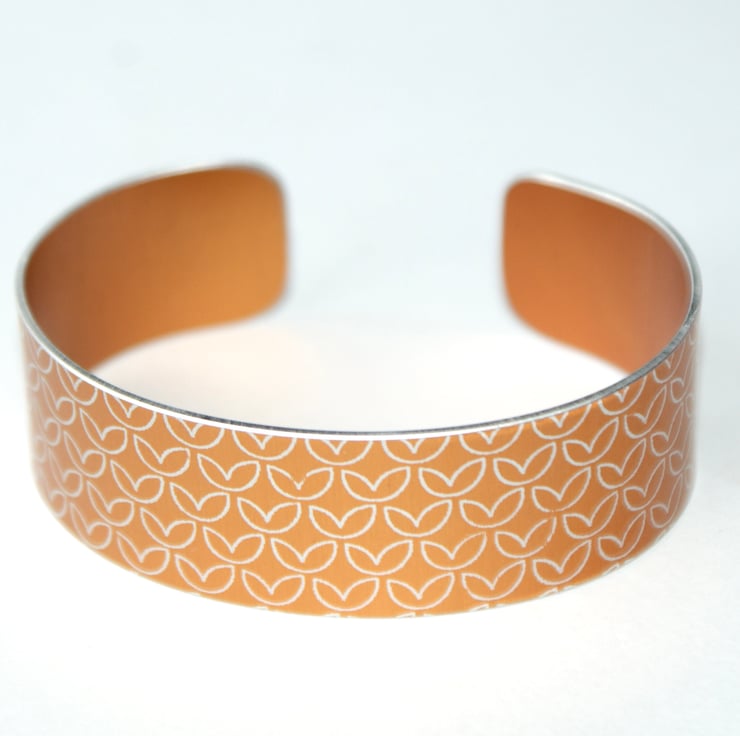 A striking bracelet/cuff made from anodised aluminium with a leaf pattern from my own hand drawing. I made the drawing into a resist and applied it to the metal. I then dye the aluminium, seal it and remove the resist which leaves the pattern showing in the original colour of the metal. The cuff is then made using traditional metalworking techniques.