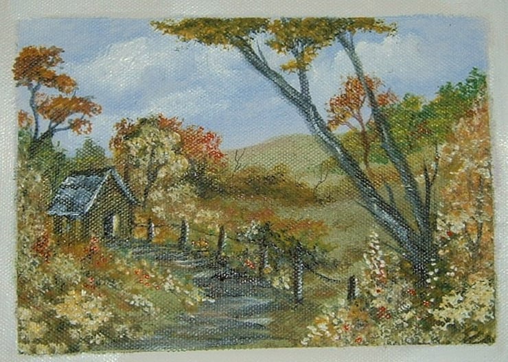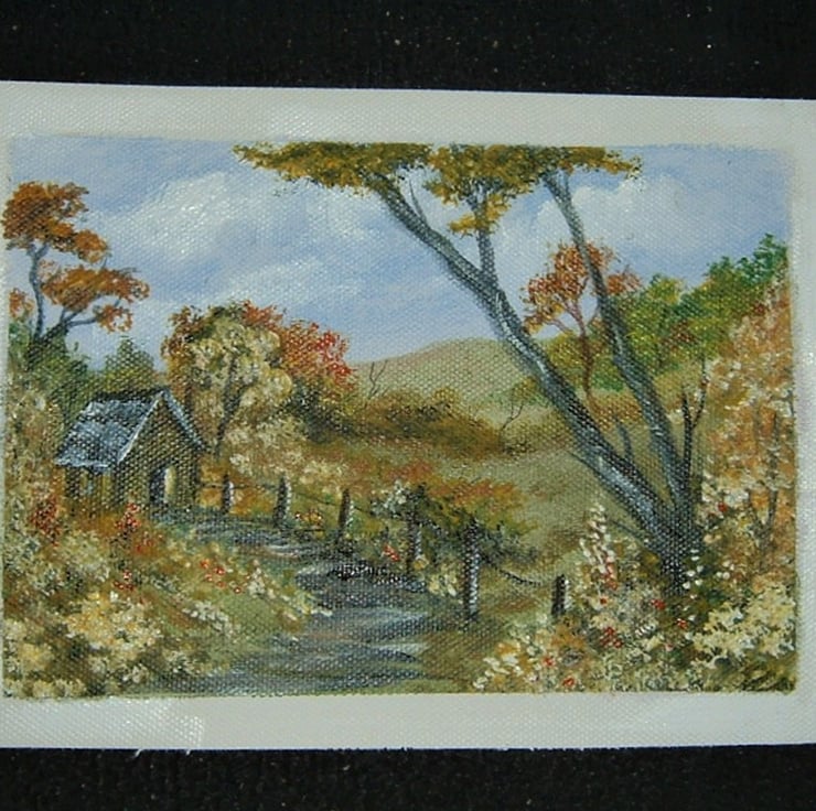 The painting itself is on canvas paper and has a small white border around it, which can be left or trimmed off to fit a frame.