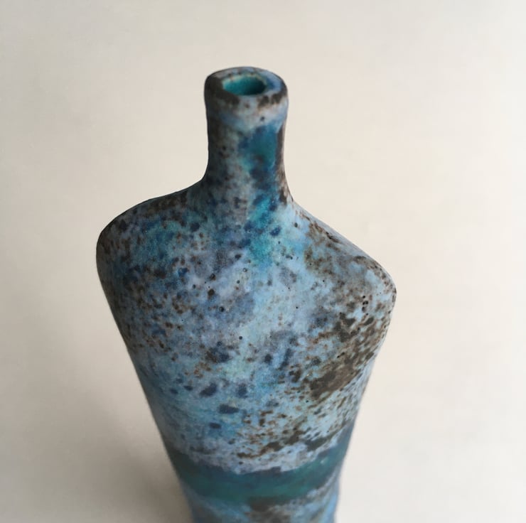 An elegant handmade ceramic bottle featuring a lichen, stone inspired turquoise glaze.