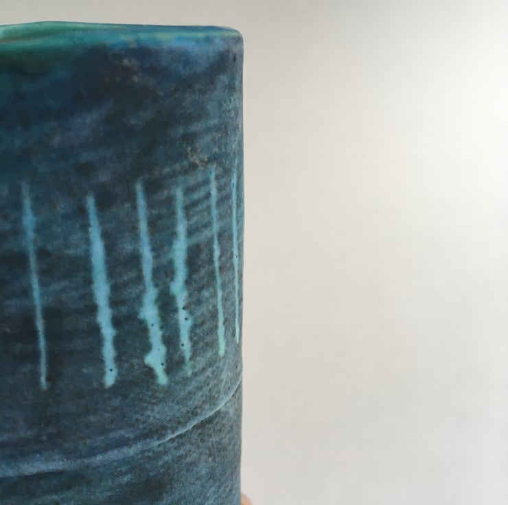 Seashore inspired decoration has been applied with slip and overgrazed with turquoise resulting in a muted blue/grey finish.