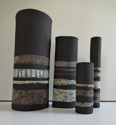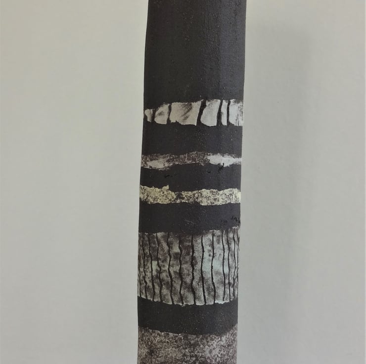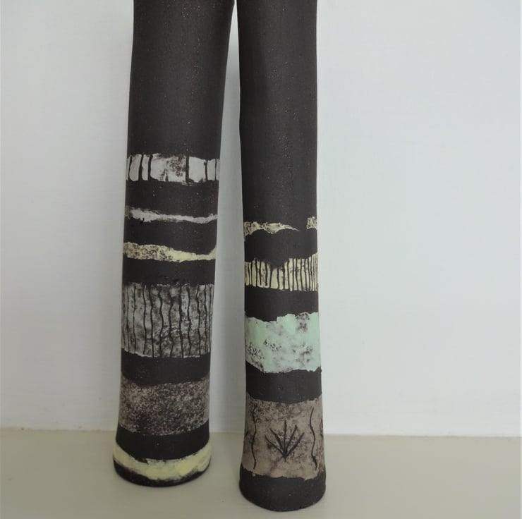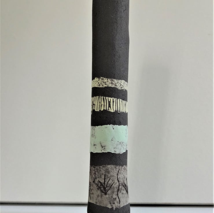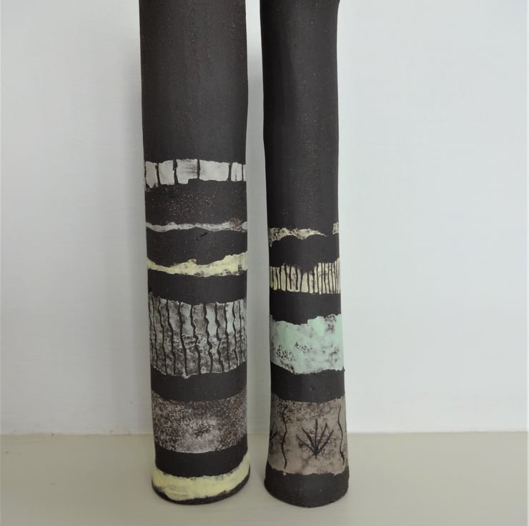Priced for the pair, these slim black stoneware pieces go together 'in conversation' and though designed to catch the eye just as they are, they could hold a couple of dried grass stems or a lightweight single bloom. I designed them to stand at a slight angle, and each has bands of pastel shades against the natural finish of the black stoneware clay. Lightly glazed inside. Esme has sgraffito decoration of marsh grass motifs, and Esme has sgraffito decoration of tendrils and lines. They look good with other pieces from the Lucienne Collection or Simple Earth Collection as shown in the final image. For urban or country interiors. 16cms high approx. The price is for the pair - they are friends and don't like to be separated!