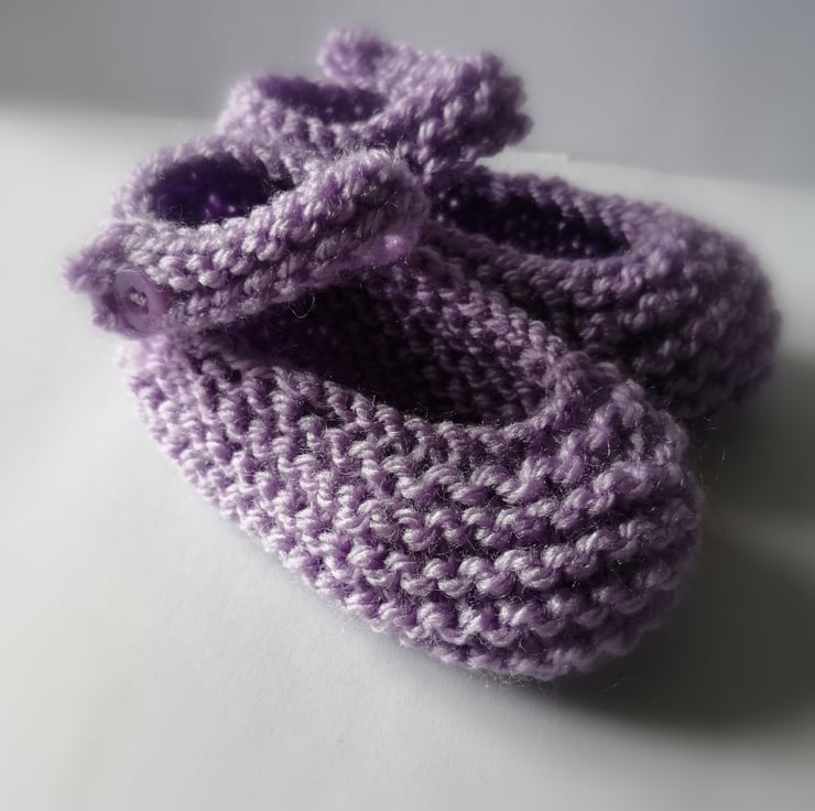 Hand knitted baby shoes, knitted using a soft wool in a lovely light purple. Fasten at the side with one button.