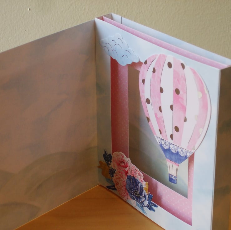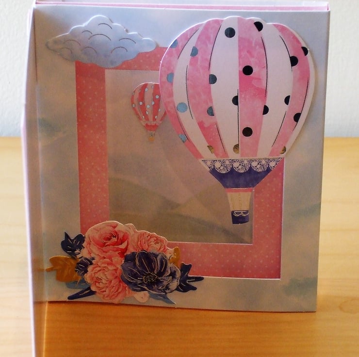 On the front is a flat image of a pink hot air balloon decorated with flowers and a circle greeting with the words " Just A Note To Lift Your Spirits" Inside is a 3D scene in 3 layers featuring hot air balloons flying over the hills, the bottom corner has been decorated with flowers to match the image on the front.