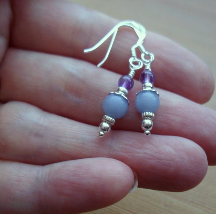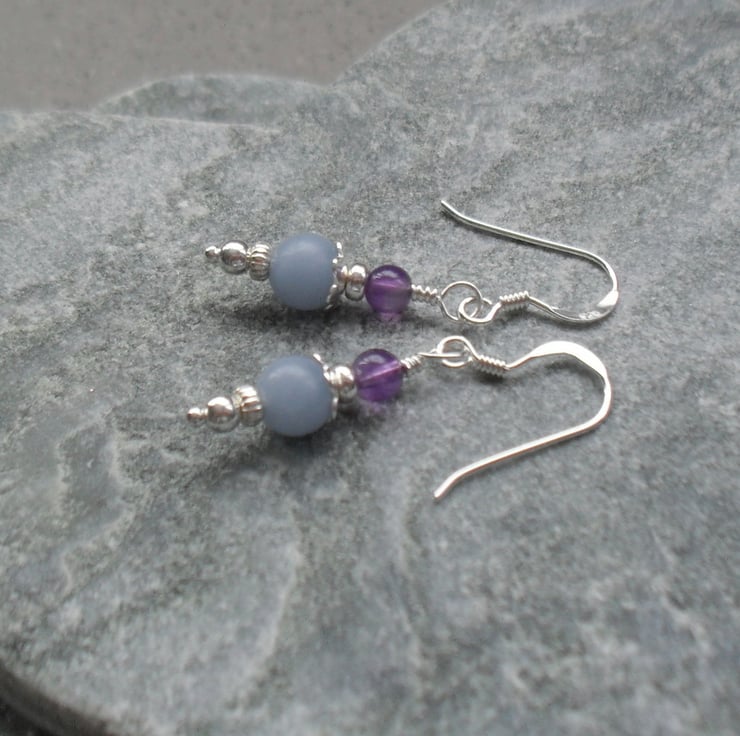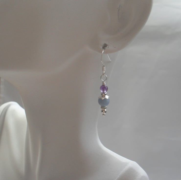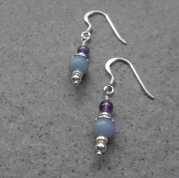 Blue angelite and purple amethyst semi precious gemstones are attached to sterling silver ear wires earrings also have sterling silver beads