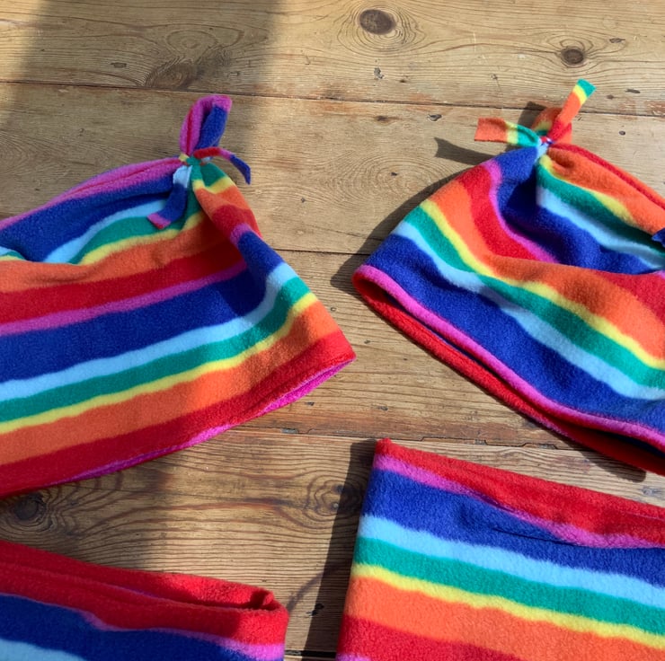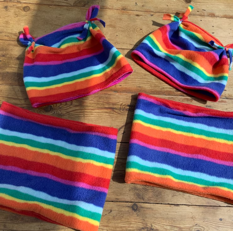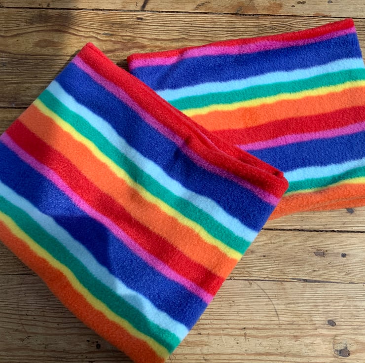 Gorgeous snuggly Rainbow fleece neck warmers and hats. Neck Warmer Can be pulled up over face if you find yourself in a crowded place. WARNING; This is not to be used as PPE.