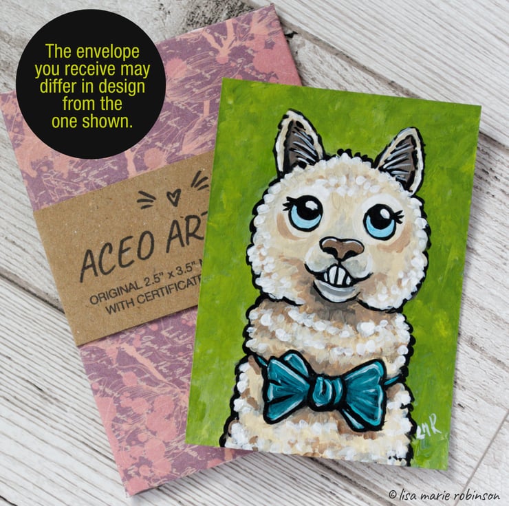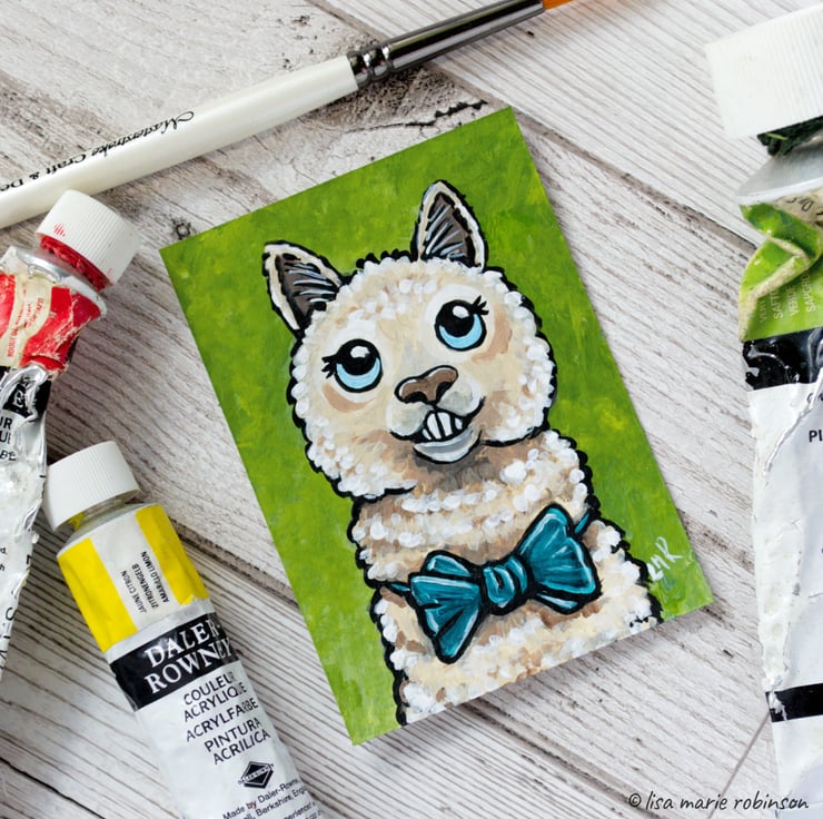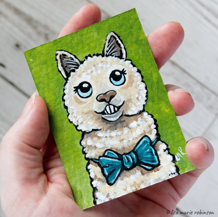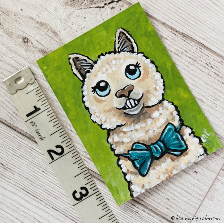 Miniature ACEO painting of a super fluffy cream alpaca (or is he a llama) with a toothy grin and big blue eyes. His name is Stanley and he loves to wear a bow tie to bring out the colour of his eyes!!