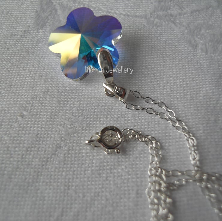 The flower has a sterling silver bail and is on a sterling silver, 18 inch (45.7mm) trace chain - you can just see the 925 stamp on the bail and clasp in one of the photos.