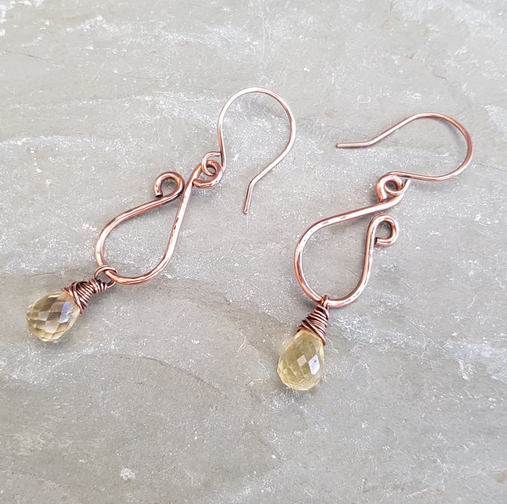 I have formed the earrings using solid copper wire then added a citrine drop, they hang from handmade copper ear wires.