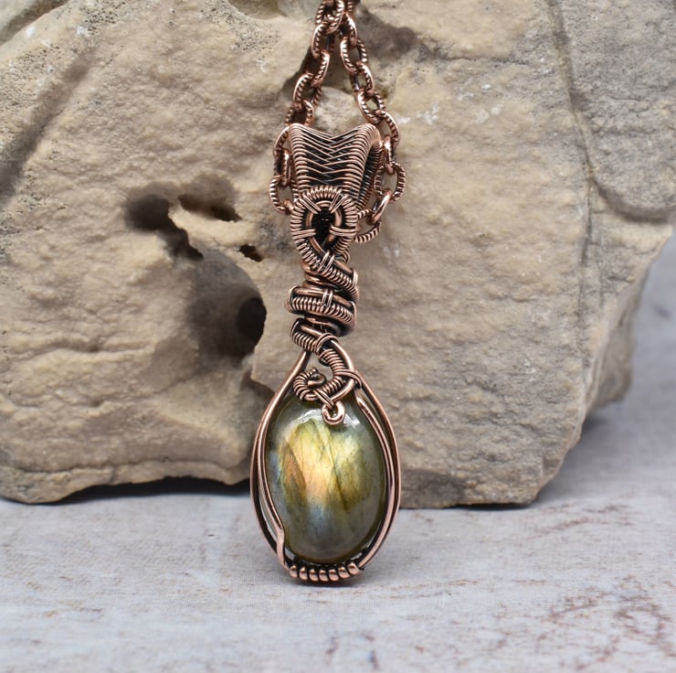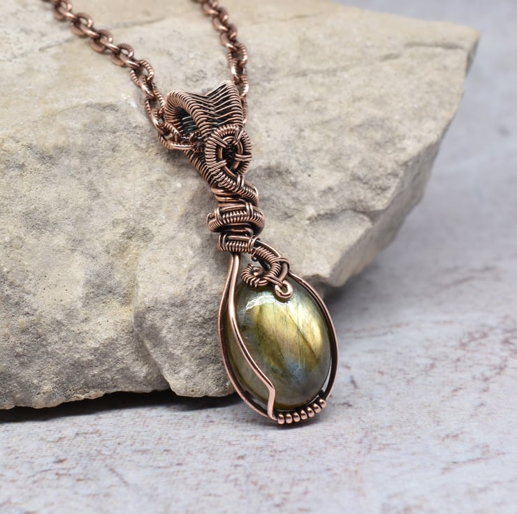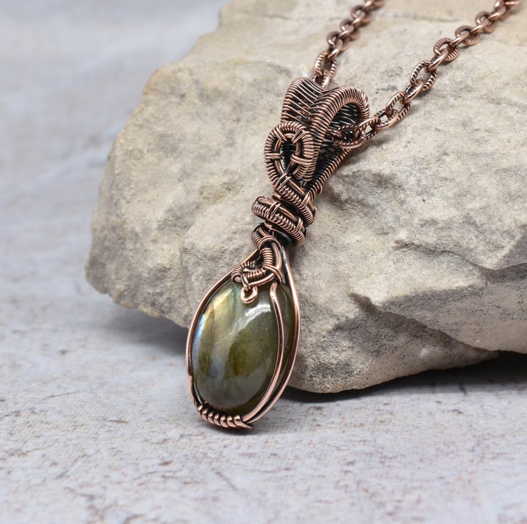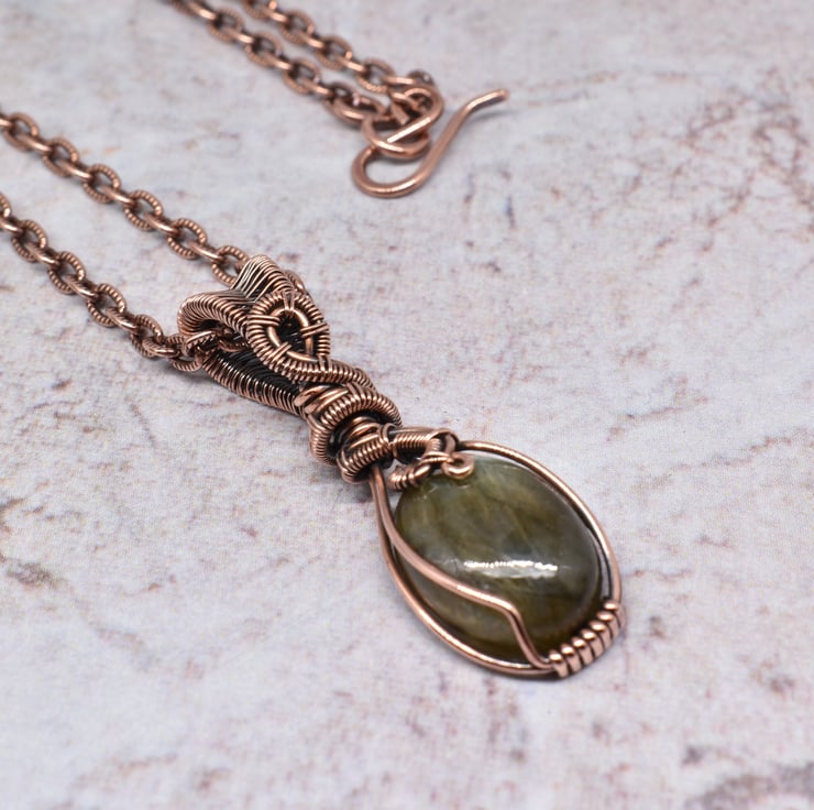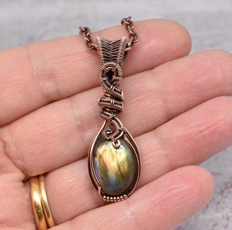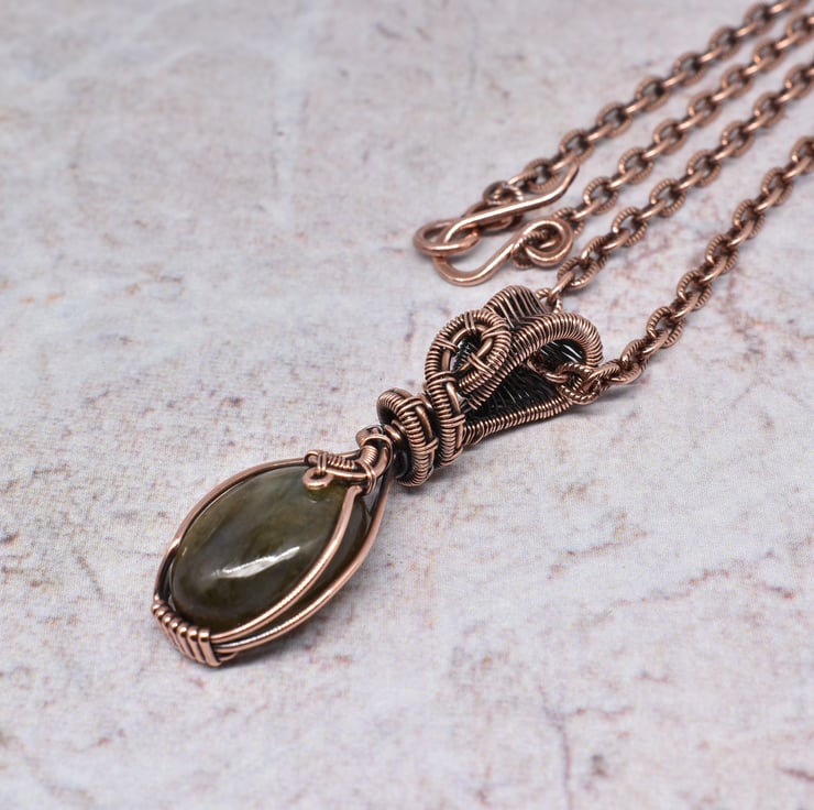 I have wire wrapped this pretty labradorite using solid copper wire to make this dainty pendant which hangs from a copper chain with handmade clasp.