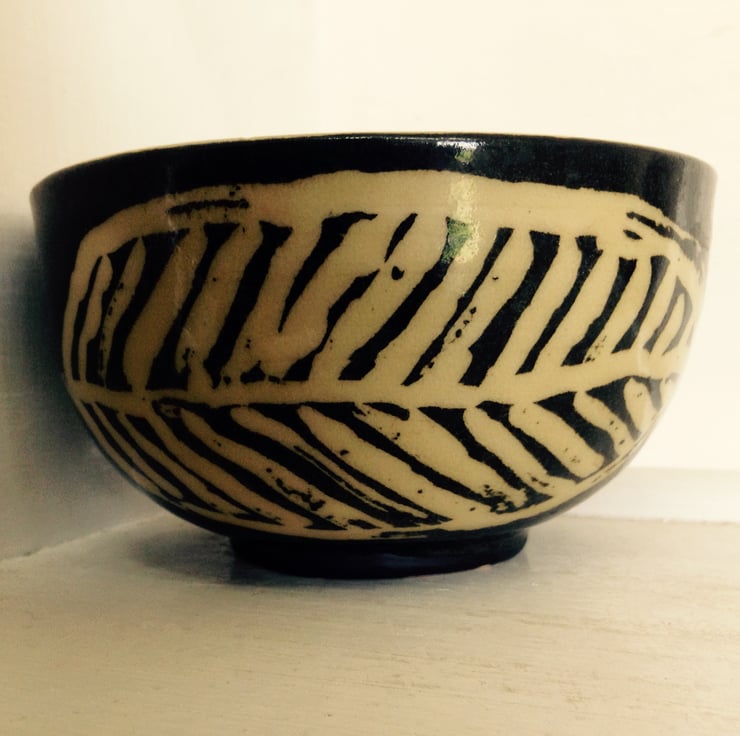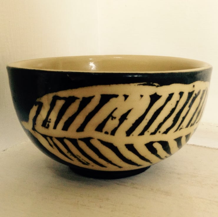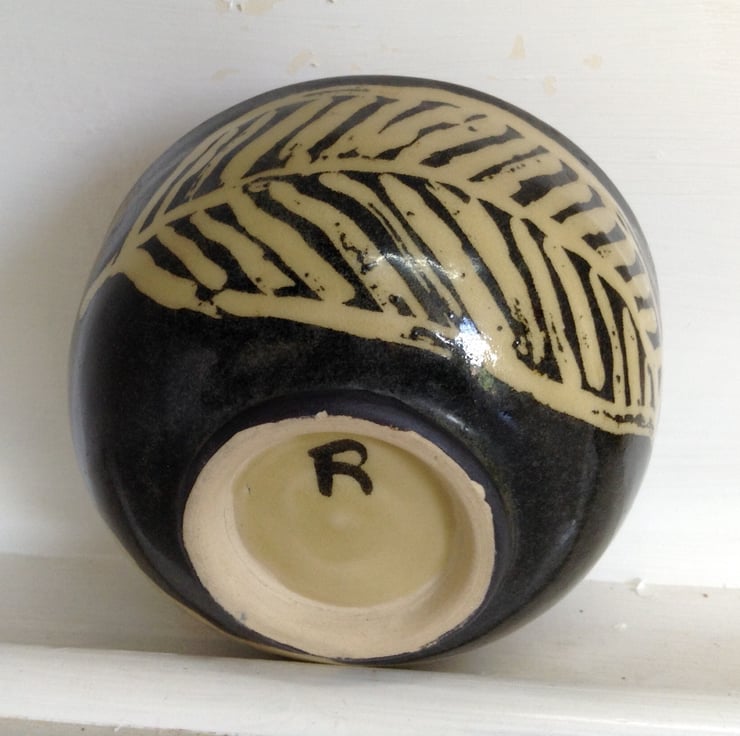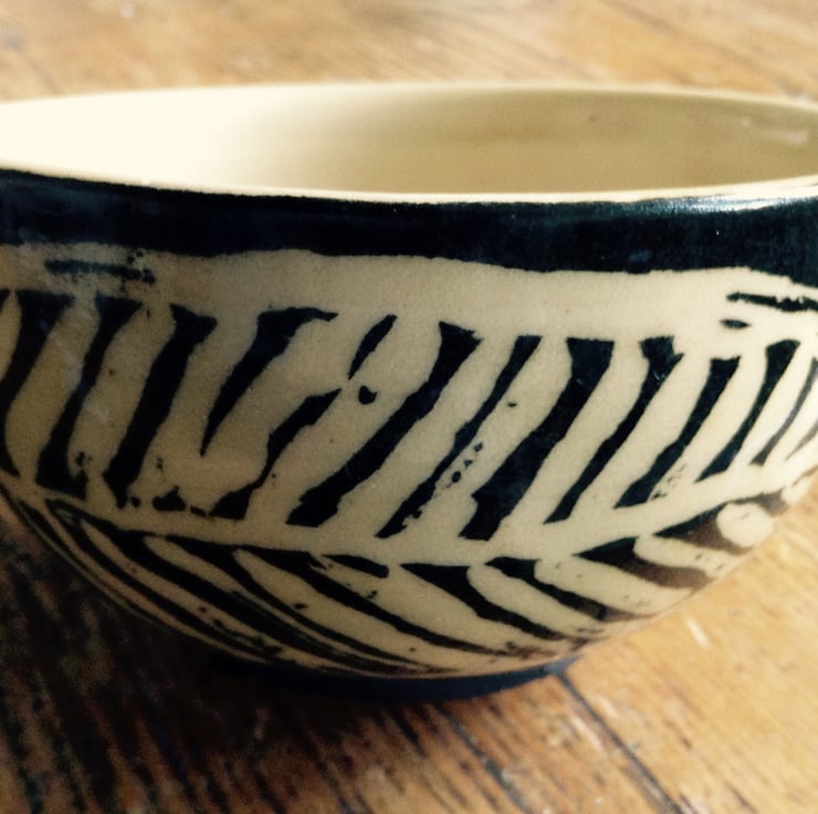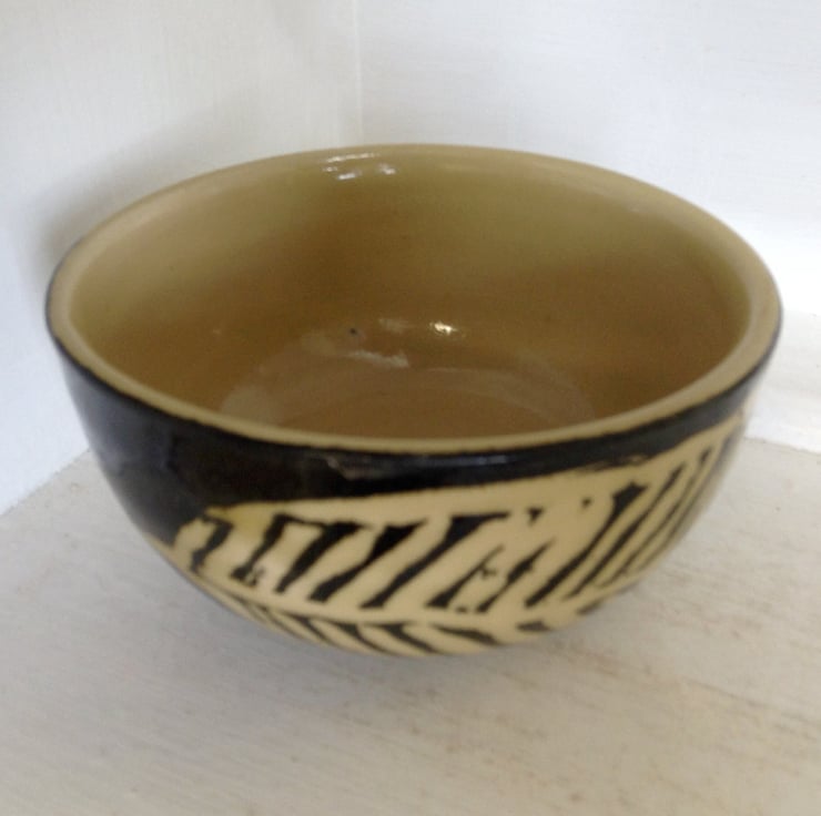 Small hand thrown stoneware bowl with a simple brown iron oxide and cream leaf design.The bowl has a transparent pale honey glaze. It measures 11.5 cms across and is 6 cms deep. It is microwave and dishwasher safe. It is great for nuts and dips