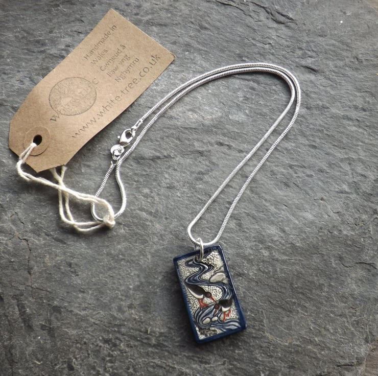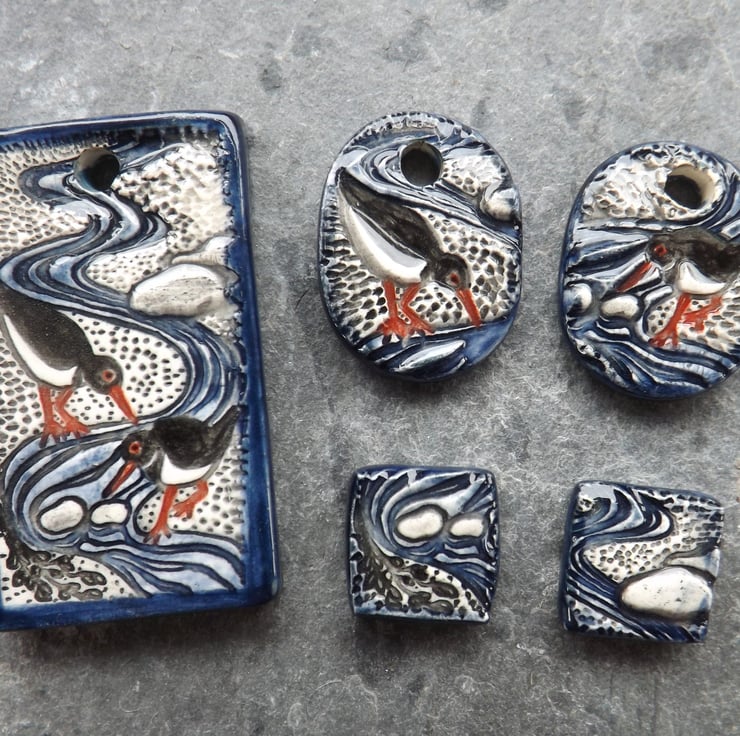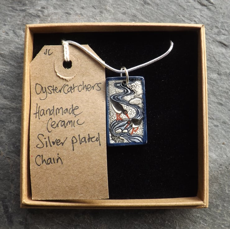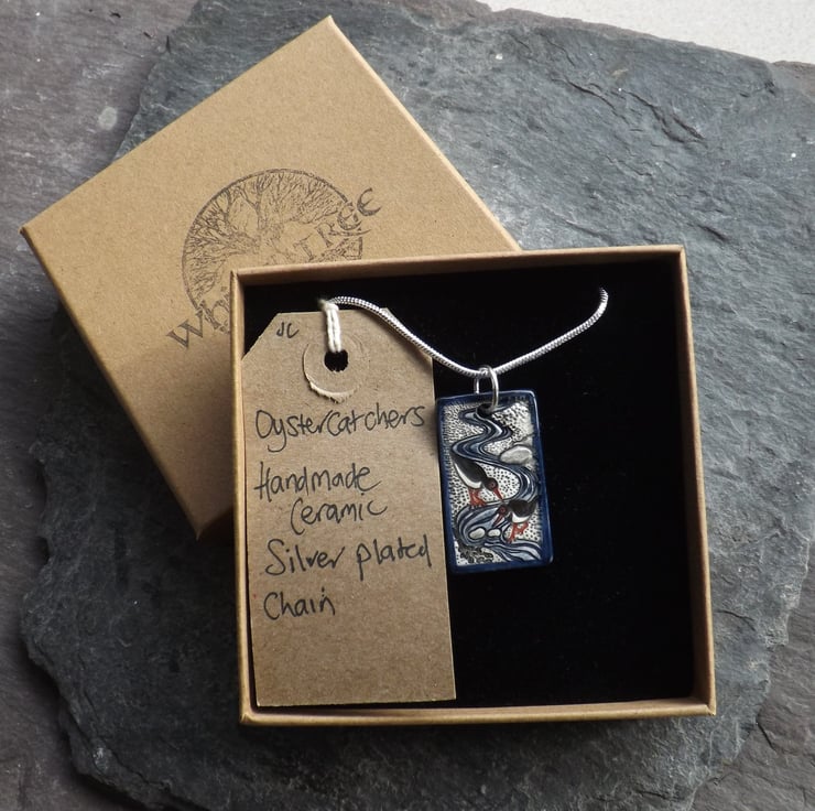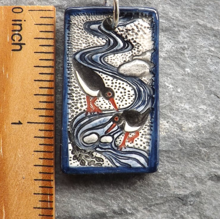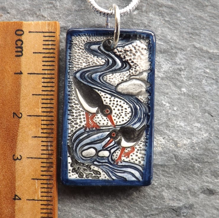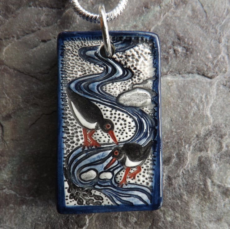 The oystercatcher, or pioden-y-môr in Welsh, is one of my favourite birds. I love to watch them by the seashore foraging, with their bright red legs and bills and distinctive piping call. This pendant is my celebration of the oystercatcher in a dainty miniature scene.