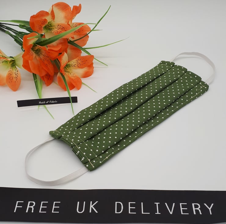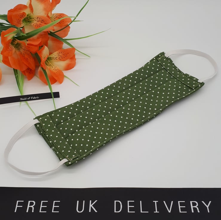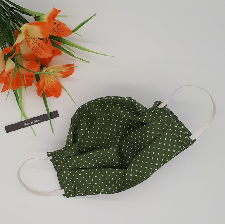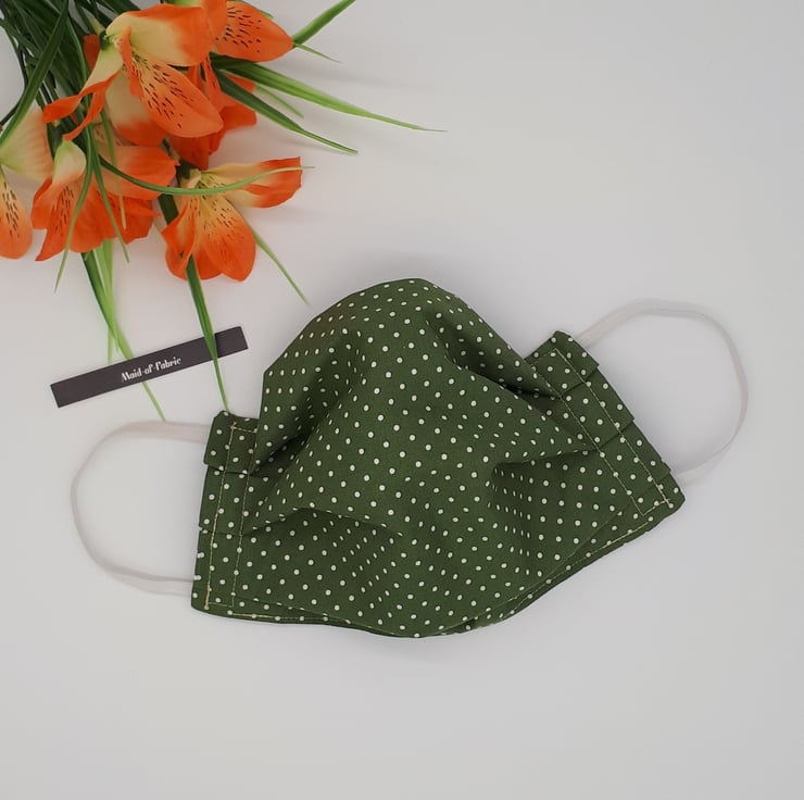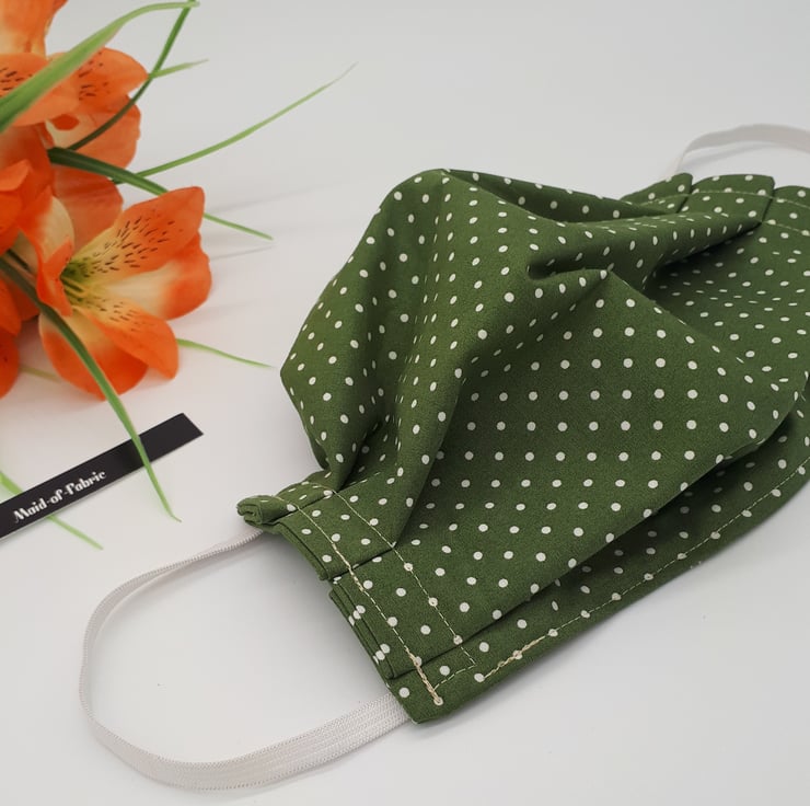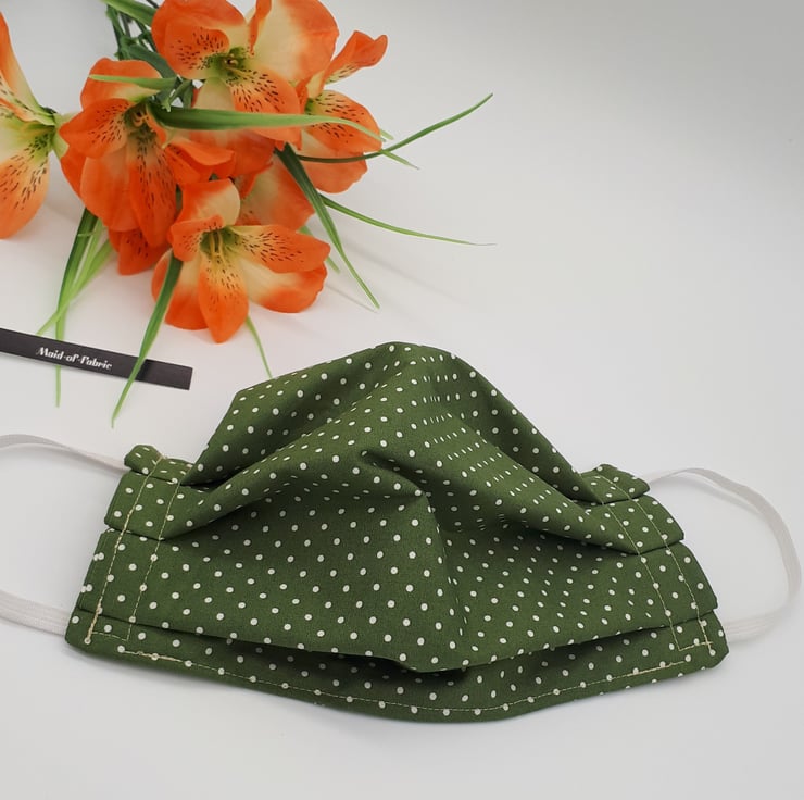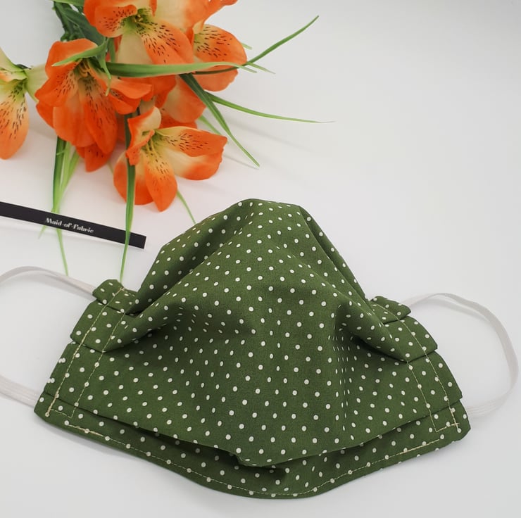 Face mask made using green and white polkadot cotton fabric and white elastic.