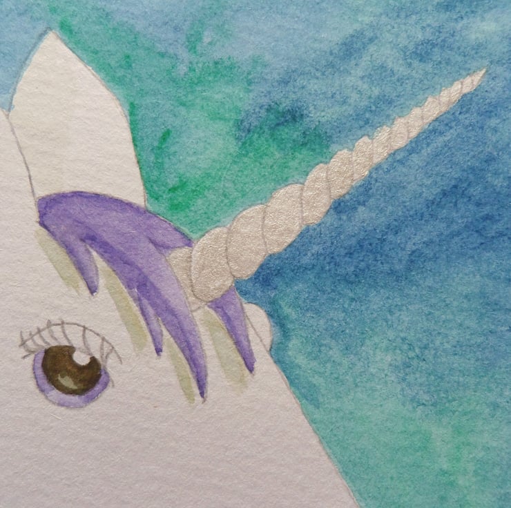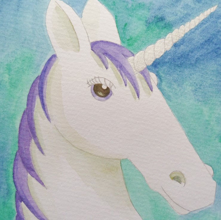 A unicorn painting featuring a white unicorn with purple mane, silver horn and a blue and green background.