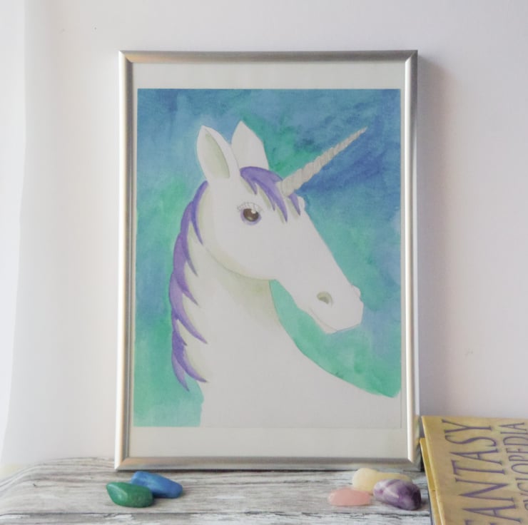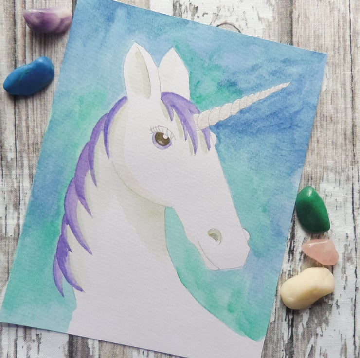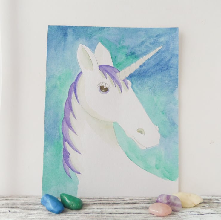 This unicorn is hand painted with watercolours on watercolour paper and measures approximately 24.9cm high x 19.5cm wide.