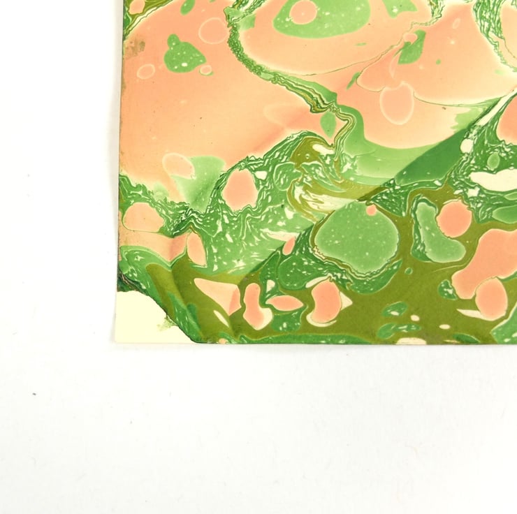 Marbled onto 120gsm FSC yellow base paper (please see my about section for more details on the papers). The sheet is approx 216mm x 306mm, long grain.