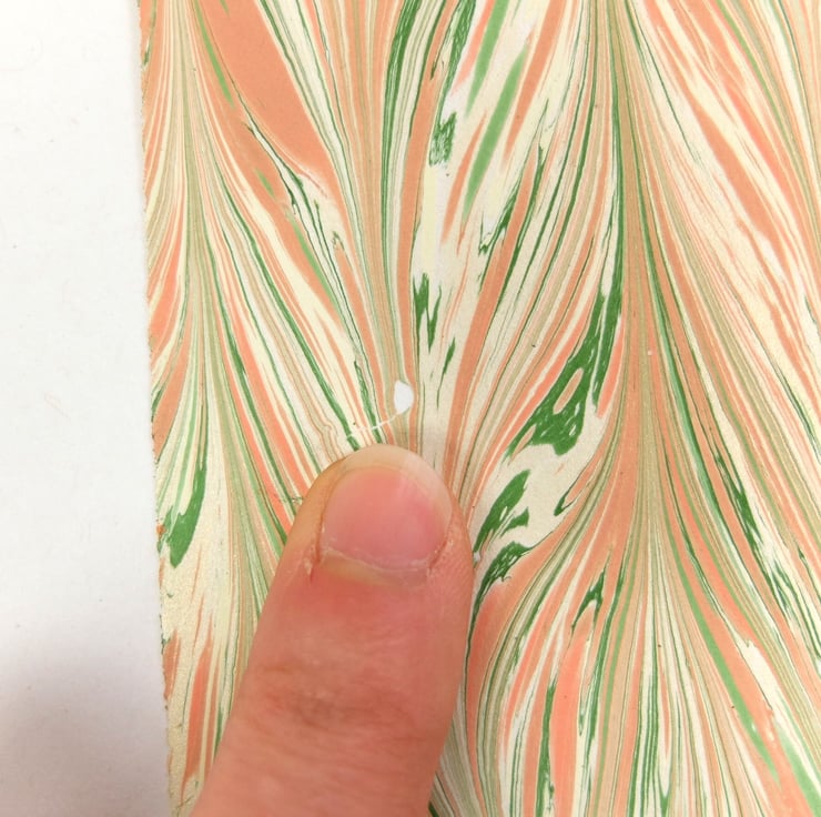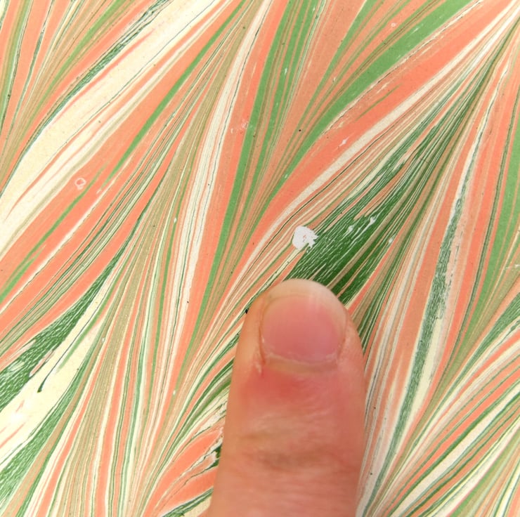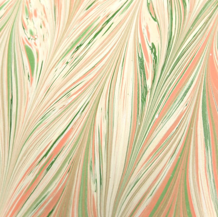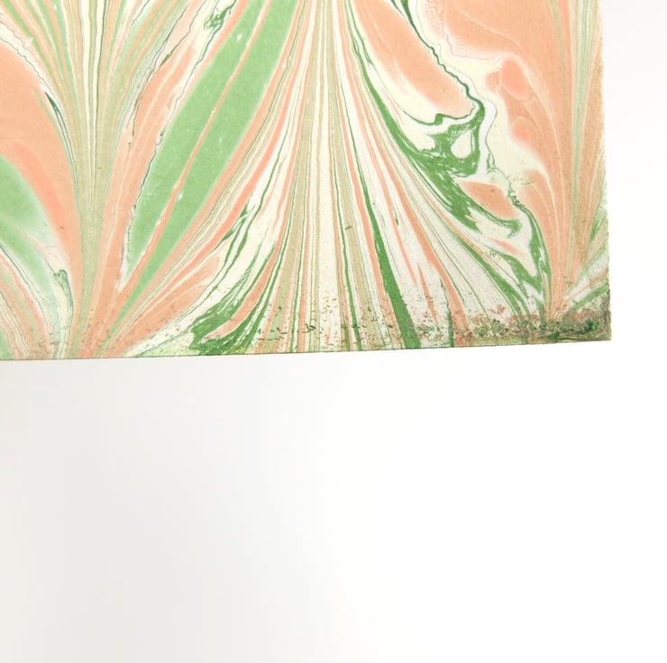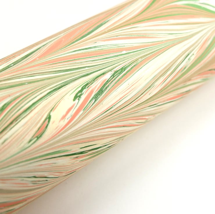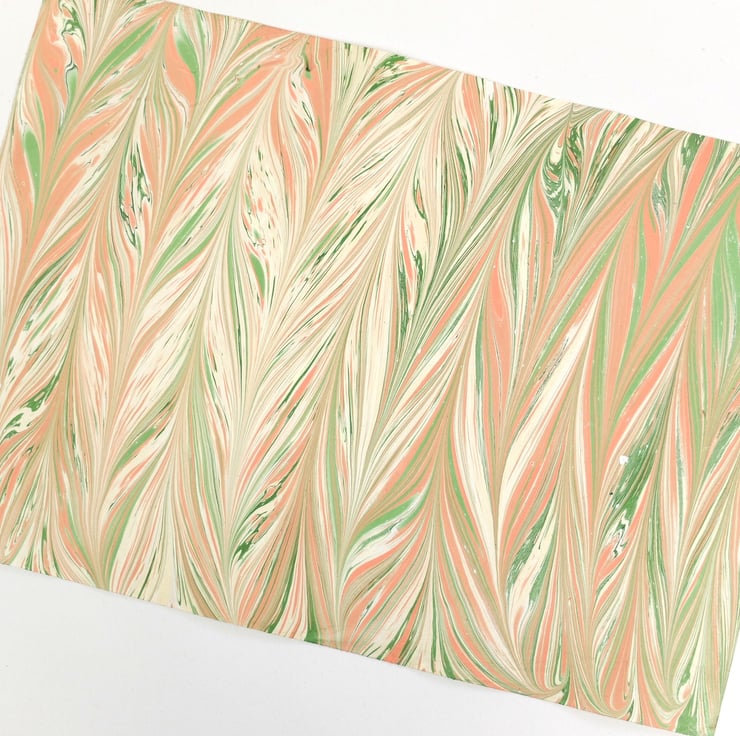 A subtle and feminine coloured chevron (gelgit) patterned A4 hand marbled paper sheet listed as a slight second. The fault on this sheet is two small white spots and a small area of pigmentation bleed on one edge (pictured).