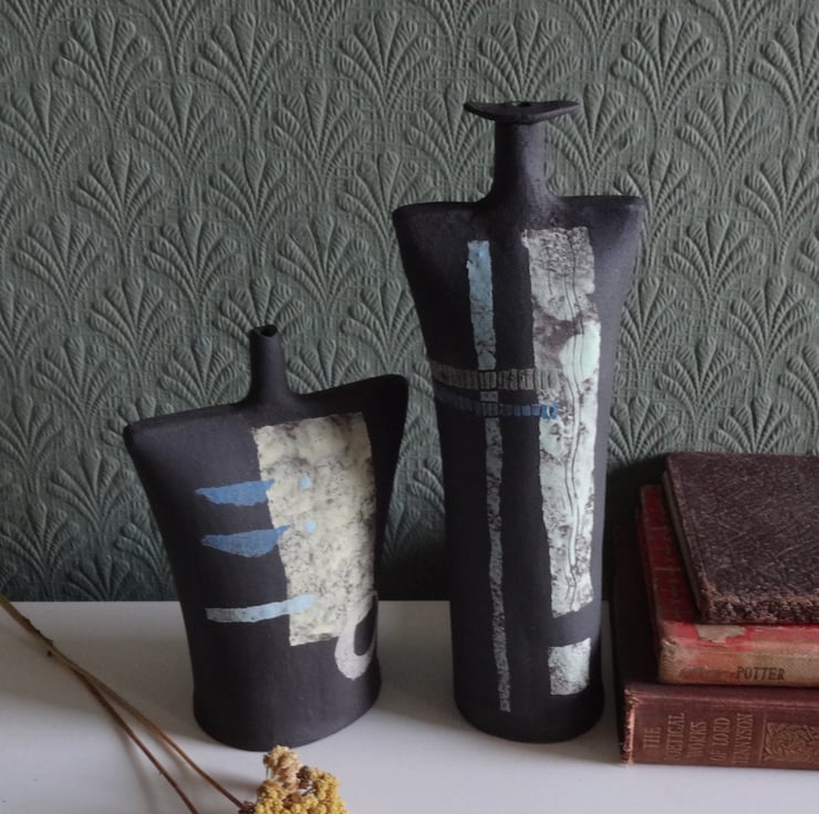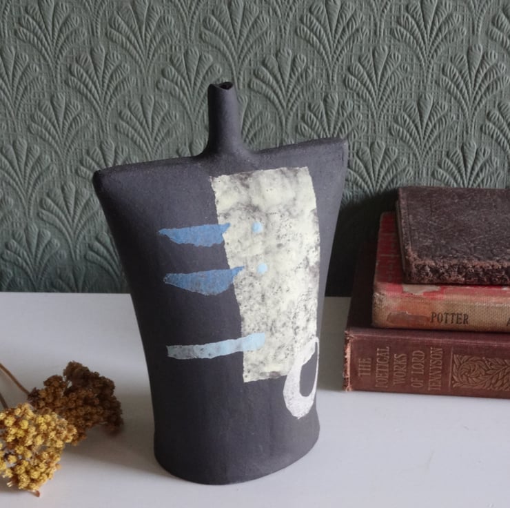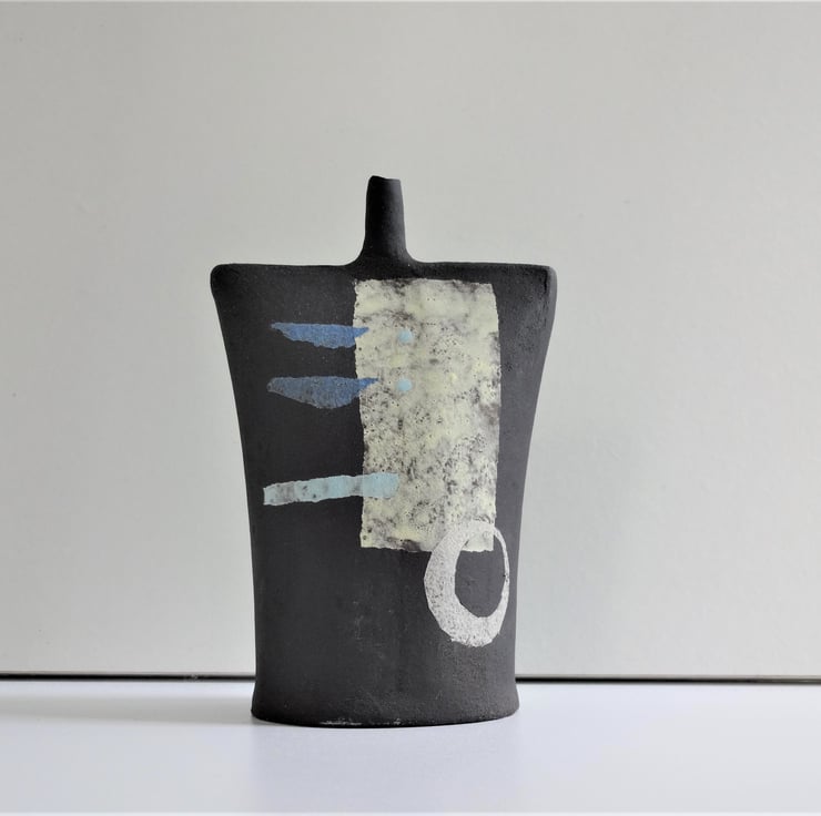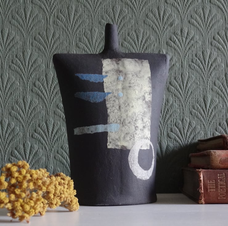A black stoneware art sculpture to add a focal point to your living space. Titled Constantin, the pastel shades of the striking decorative motif will harmonise with most contemporary colour schemes in your rooms - urban chic or country style. I have used a combination of abstract rectangle, circle, and stripes and these are fired into the piece. Constantin is part of the Kindred Collection, a family of handmade black stoneware pieces, each one with its own distinctive shape, decoration and personality. Constantin is broad shouldered and 14 cms tall. He can be a stand alone piece, or looks handsome as part of a ‘family group’ of different sizes. The simple figurative form and abstract decoration can make a contemplative focal point for yoga/mindfulness meditation. On the base you’ll find my potter's mark of a swallow in flight.