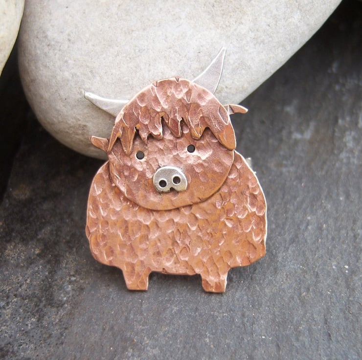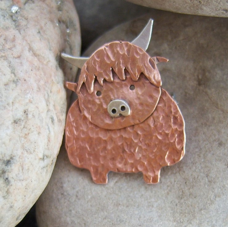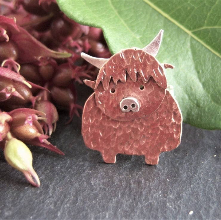 A rustic quirky Highland cow cut from copper and then textured. Approximately 3cms tall, including the horn. Sterling silver horns, nose & fastener.