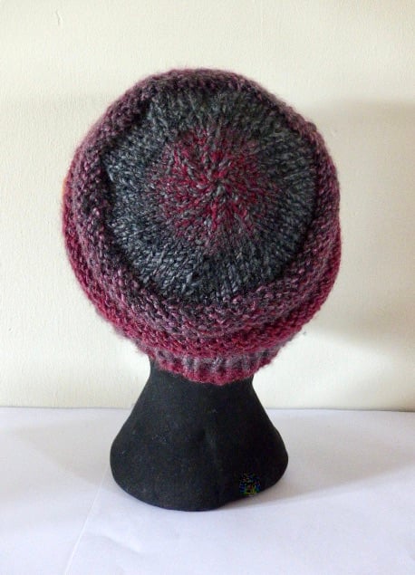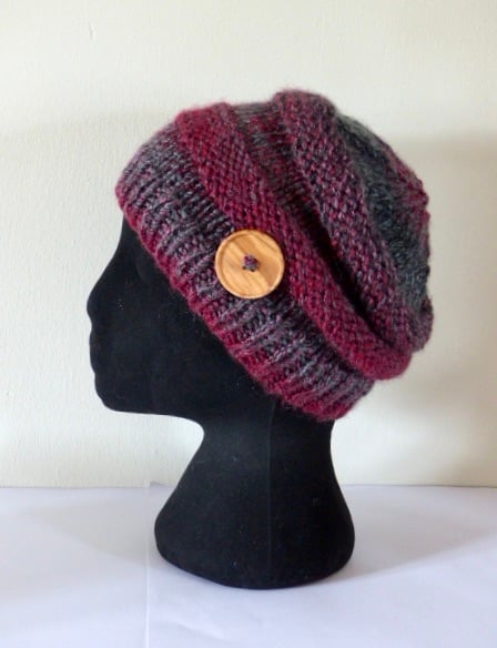 A hand knitted beanie hat in a chunky 100% acrylic self patterning yarn trimmed with a large natural Olive wood button. The hat measures approximately 20" around by 7" in depth but has plenty of stretch so should fit most adult heads. This style is easy to wear and the colour range through shades of dark reds and greys. This item will be sent by Royal Mail packed to arrive safely.