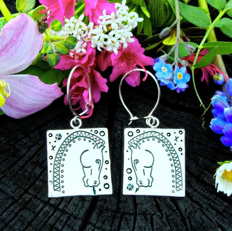These wonderful horse earrings have been designed and handmade by us in our workshop in Yorkshire. Dawn was inspired by the Elgin Marbles and Roman horse sculptures to design these horse earrings. After roller printing the images into sterling silver, the earrings have been oxidised to blacken the recesses, and then the raised areas have been highly polished to create a contrast. The number 925 is stamped on the back to signify that they are made from sterling silver. They hang from sterling silver ear wires and measure 22mm x 26mm. We also make a matching horse brooch in the same range.