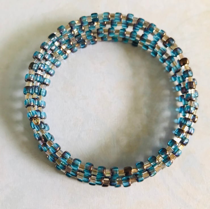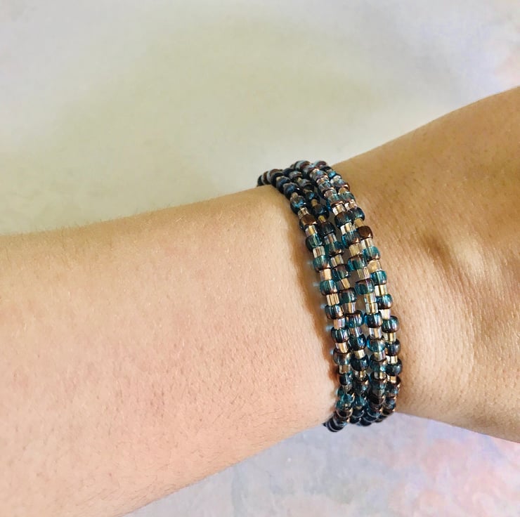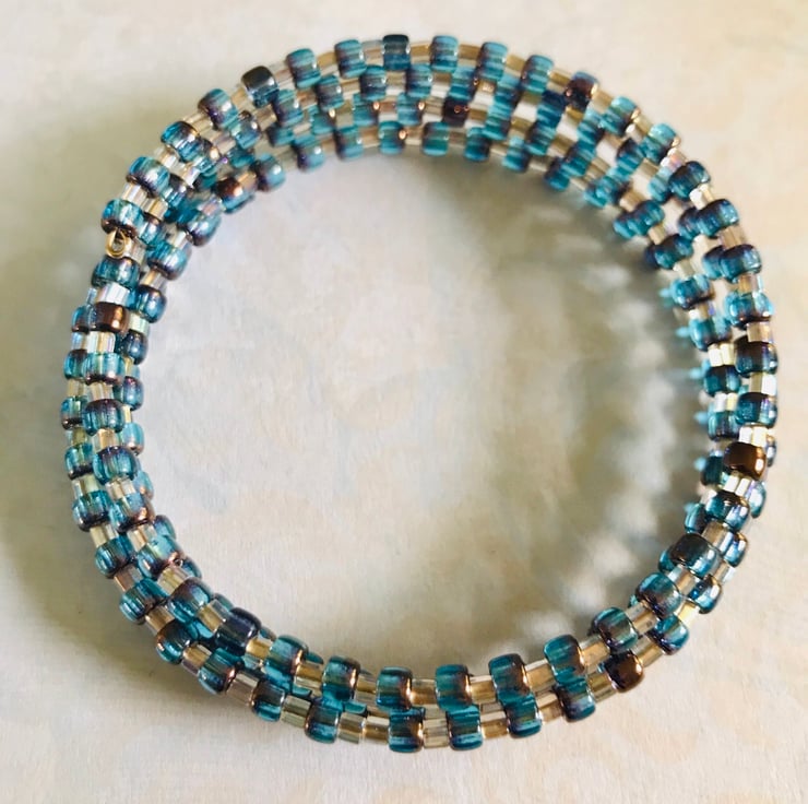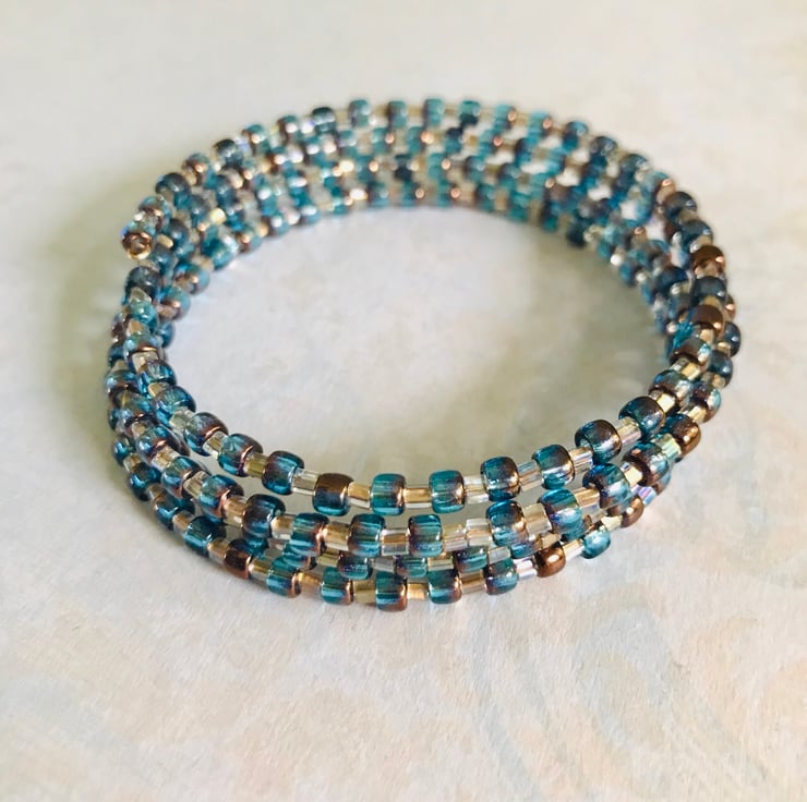 Memory wire bracelet made with bronze and blue chunky seed beads & rainbow gold lined toho beads. Can be worn on any size wrist.