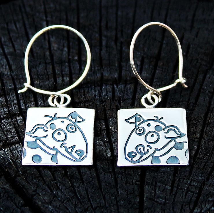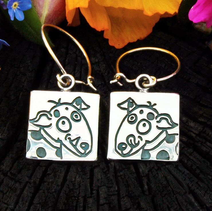 These lovely dog earrings have been designed and handmade by us in our workshop in Yorkshire. They are called Rex and Tippy after two much-loved dogs from our childhood. The dog images, which were drawn by Dawn, are roller printed into sterling silver sheet by hand using our antique rolling mill. The earrings have been oxidised to blacken them, and then the raised areas have been highly polished to create a contrast with the recessed lines. These earrings measure 16mm x 16mm with a total drop length of 40 mm. They hang on ear wires, which are also handmade by us, from sterling silver. We make matching dog earrings, ear studs, brooches and cufflinks in the same range.