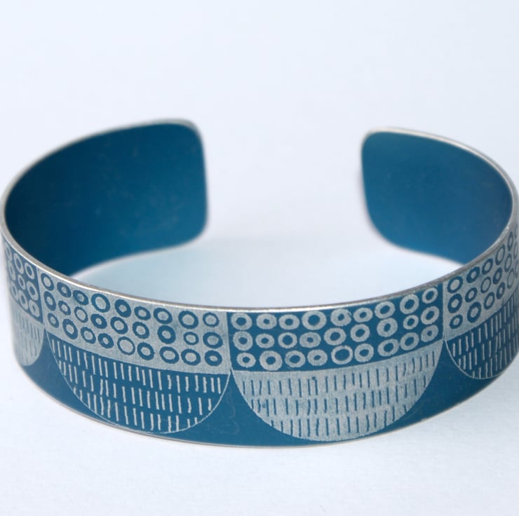 A striking bracelet/cuff made from anodised aluminium with a seed head pattern from my own hand drawing. I made the drawing into a resist and applied it to the metal. I then dye the aluminium, seal it and remove the resist which leaves the pattern showing in the original colour of the metal. The cuff is then made using traditional metalworking techniques.