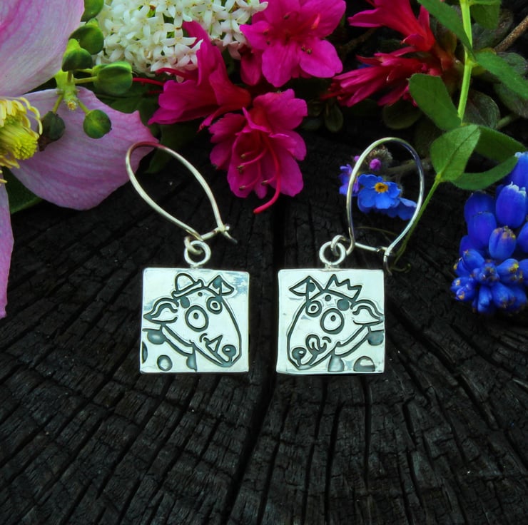 These dogs earrings, one with a bowler hat and one with a crown, are the smaller of two pairs of dog with hats earrings that we make. They have been designed and made by us in our workshop in the hills in Yorkshire. The dog images which have been designed by Dawn, are embossed into the silver by hand using our rolling mill. The earrings have been oxidised, to blacken the line drawings and then the raised areas have been highly polished to create a contrast. These earrings measure 16mm x 16mm with a total drop length of 40mm and they hang on sterling silver ear wires, that are made by us individually. We also make complimentary ear studs, earrings, brooches and cufflinks with similar dog illustration designs.