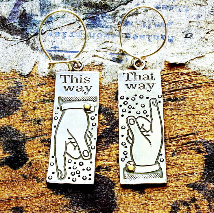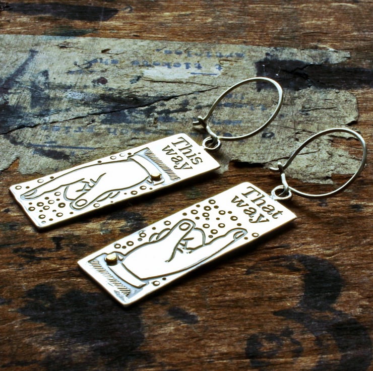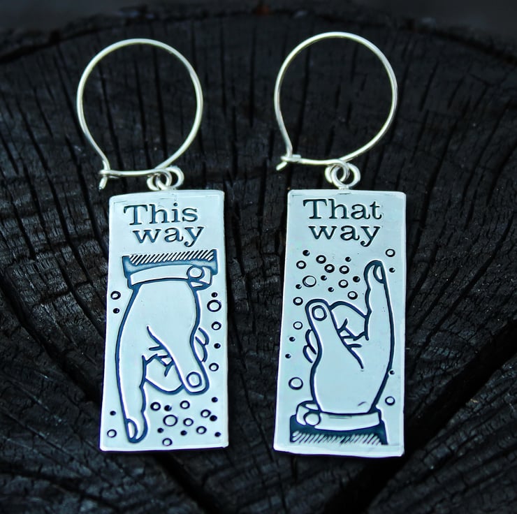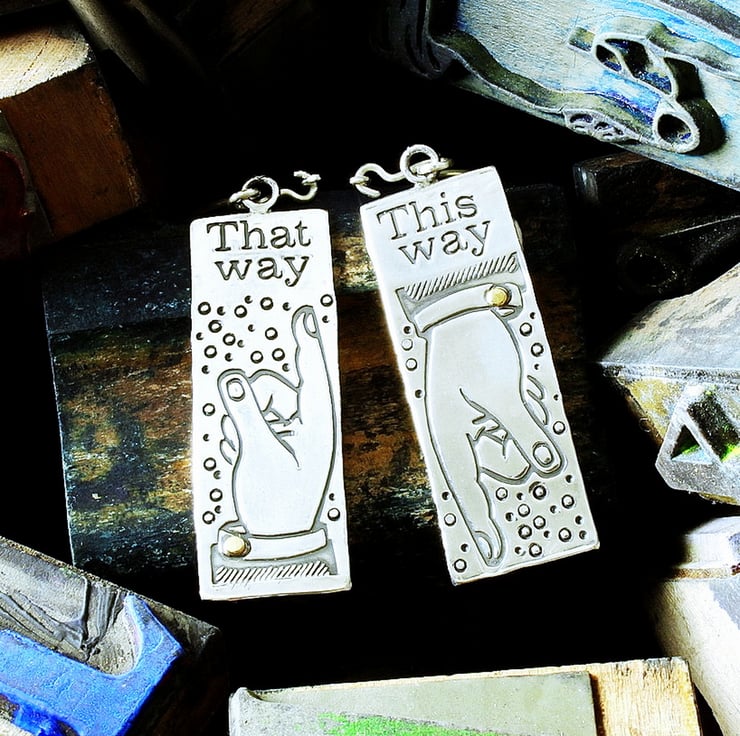 These pointing finger, 'This way, That way' earrings are made from solid sterling silver. Over the years we have been inspired by letterpress and wood block printing type face sets and have used these numerous times in our jewellery and in other creative projects. The idea for these particular earrings came from some large, antique wooden letterpress printing blocks depicting a pointing finger.