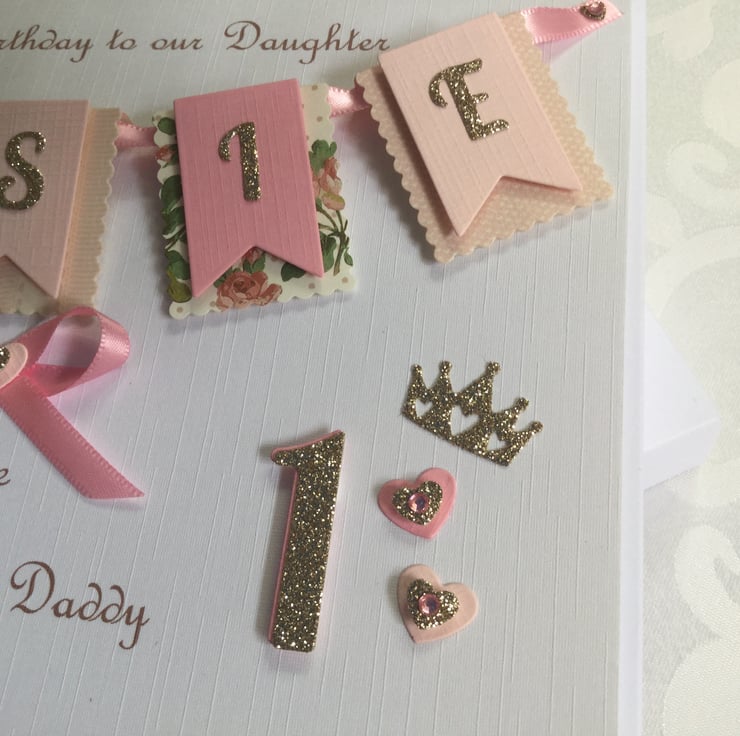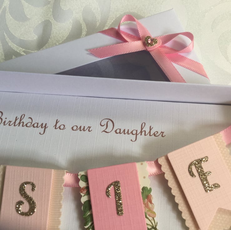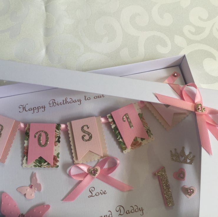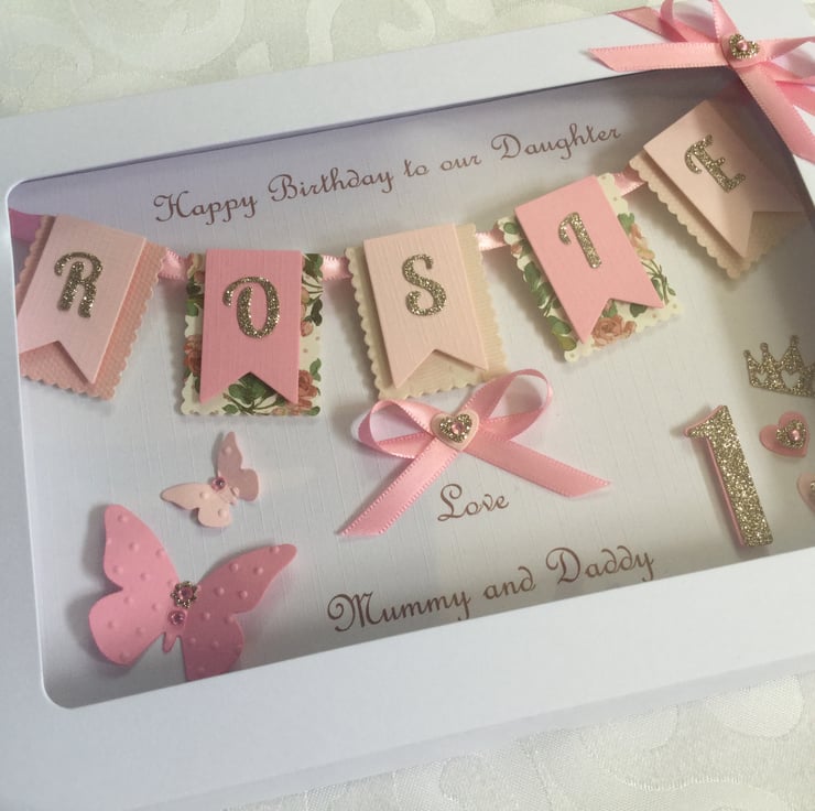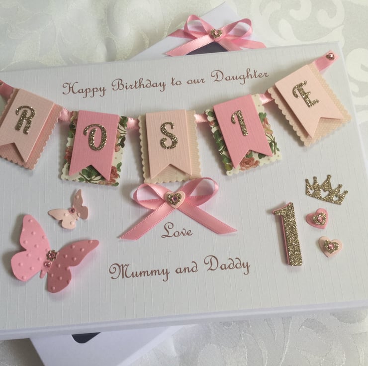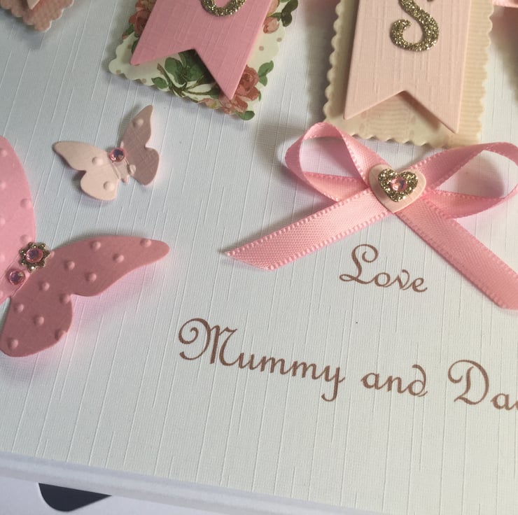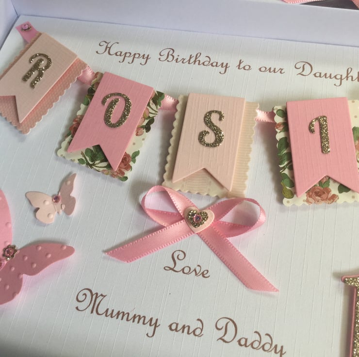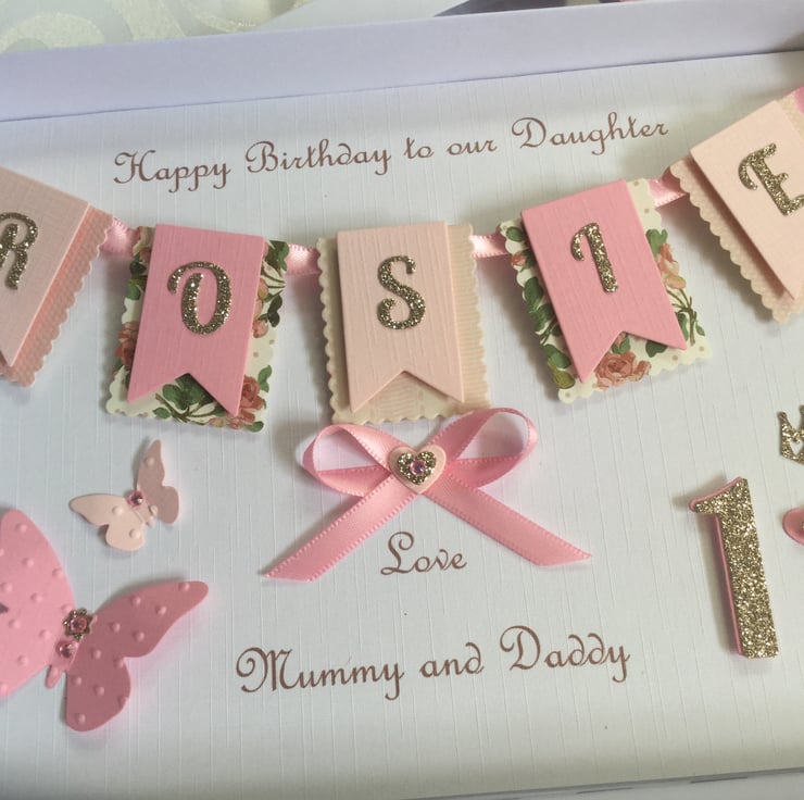 This handmade personalised card is A5 in size ( 210mm x 150mm) and is on 300gsm heavyweight linen cardstock. A name of up to seven letters can be made on the bunting. This card can be for any birthday or special occasion. Any age can be put on the card in large numbers or this can replaced with butterflies.