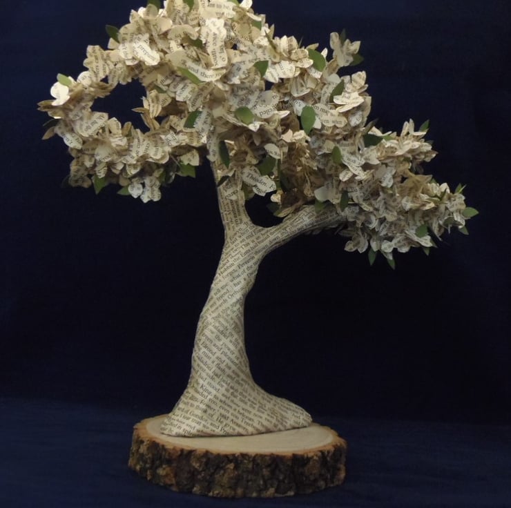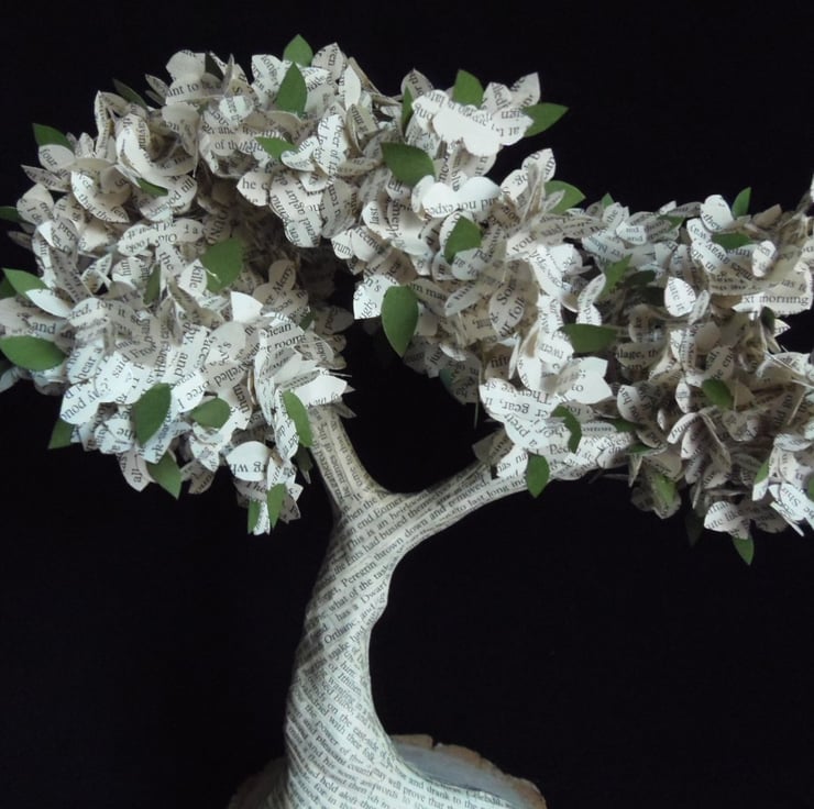 A handcrafted original, this literary bonsai tree has made using real book pages from real pages from the JRR Tolkien, Lord of the Rings novel, Return of the King.